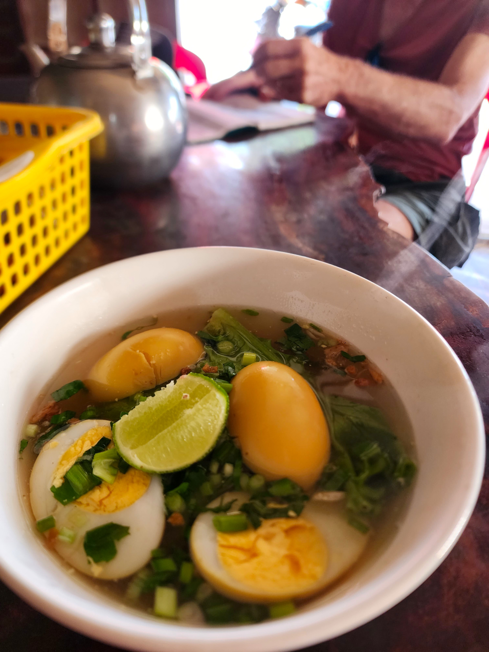 As we didn’t even have anything on hand to have for breakfast, this time we ate breakfast in the restaurant where we had our other meals — which put us a little farther away from the music. We were served a soup containing eggs so, it was sort of what we might be accustomed to for breakfast.