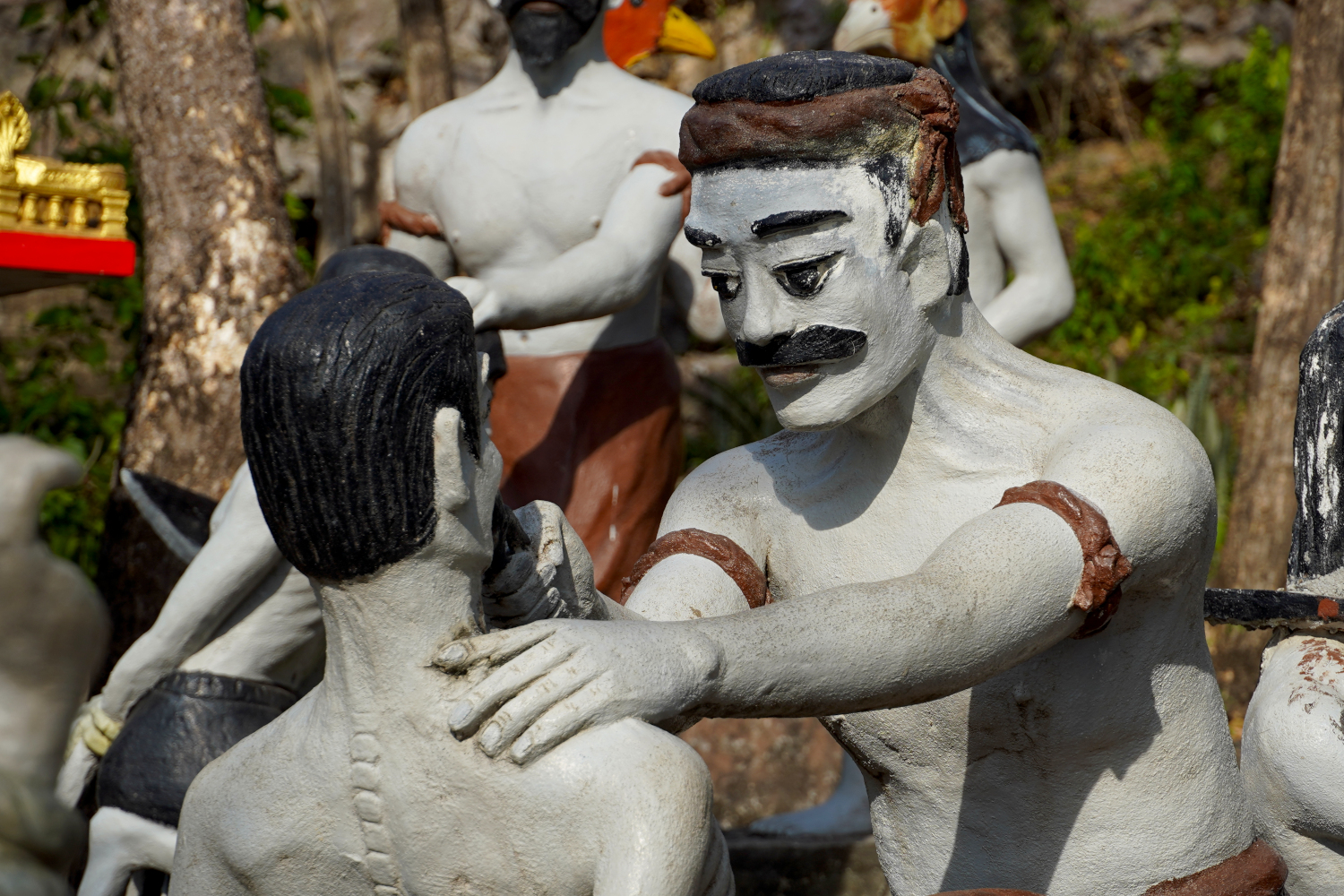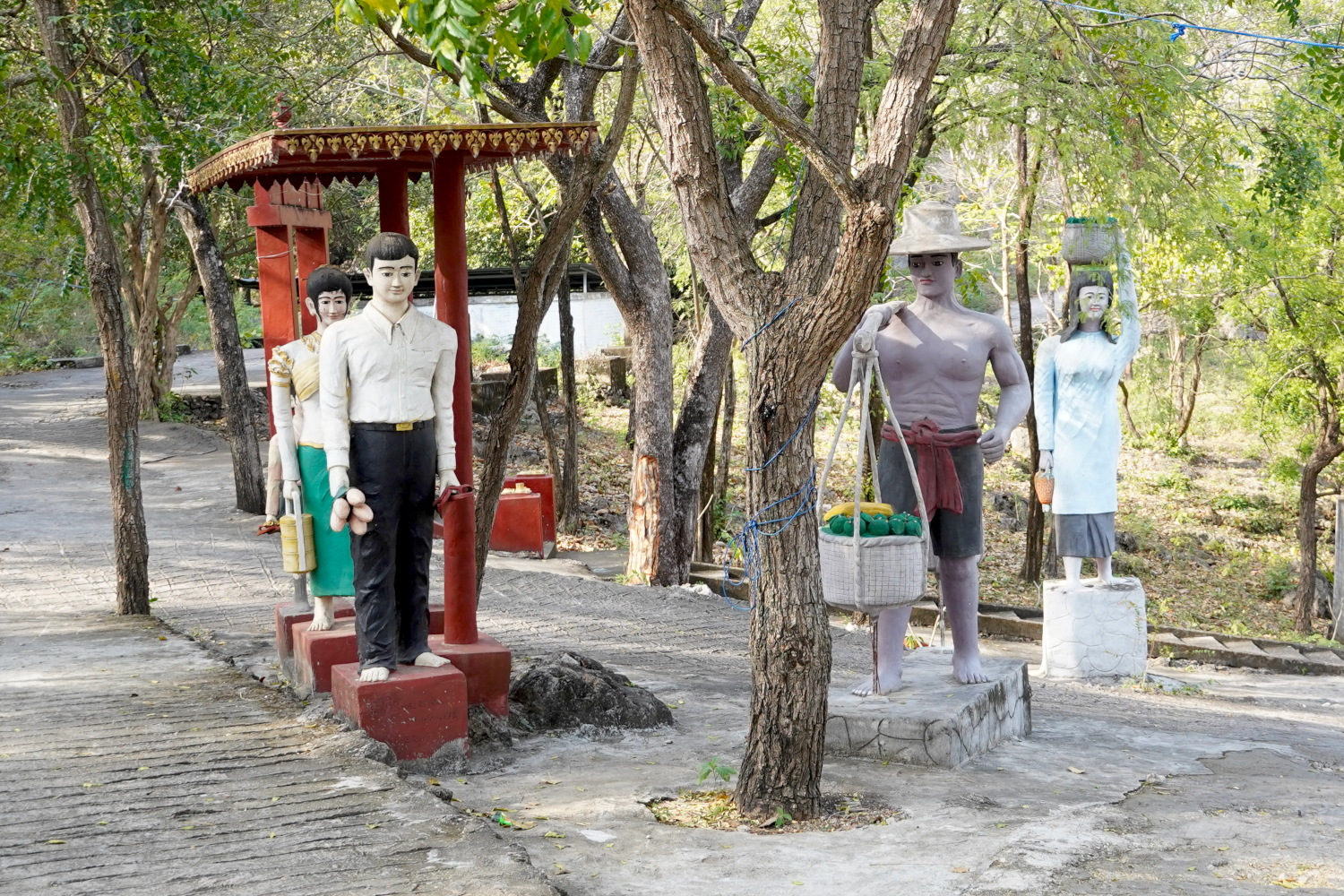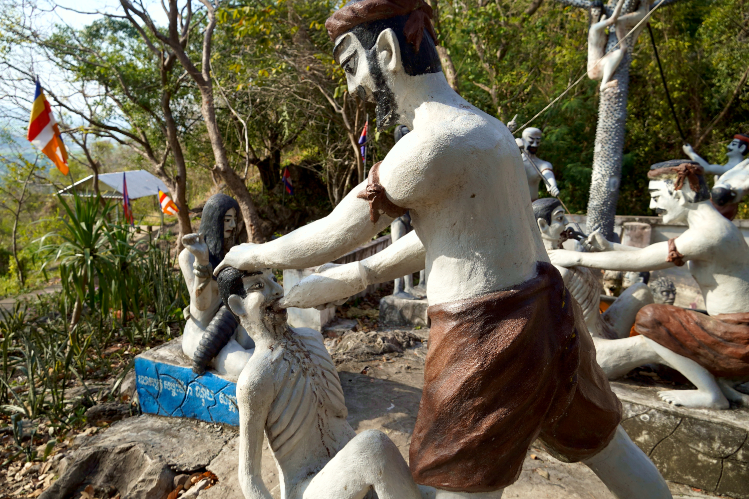 Outside the cave there was an exhibit of life-size figures demonstrating some of the tortures the regime inflicted on its victims: boiling them alive, pouring oil down their throats, yanking out their teeth, and other delights. (Plus a curious statue of two guys with bird heads duking it out.) After the victims were dead, or nearly so, they’d be carried a few yards away to an opening of the cave, into which they would be thrown, some 50 feet below to the floor of the cave.