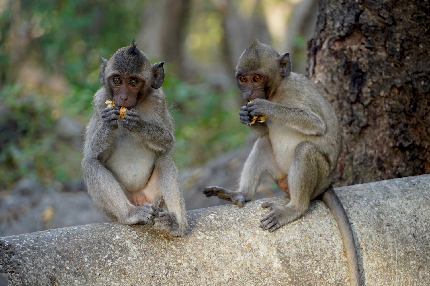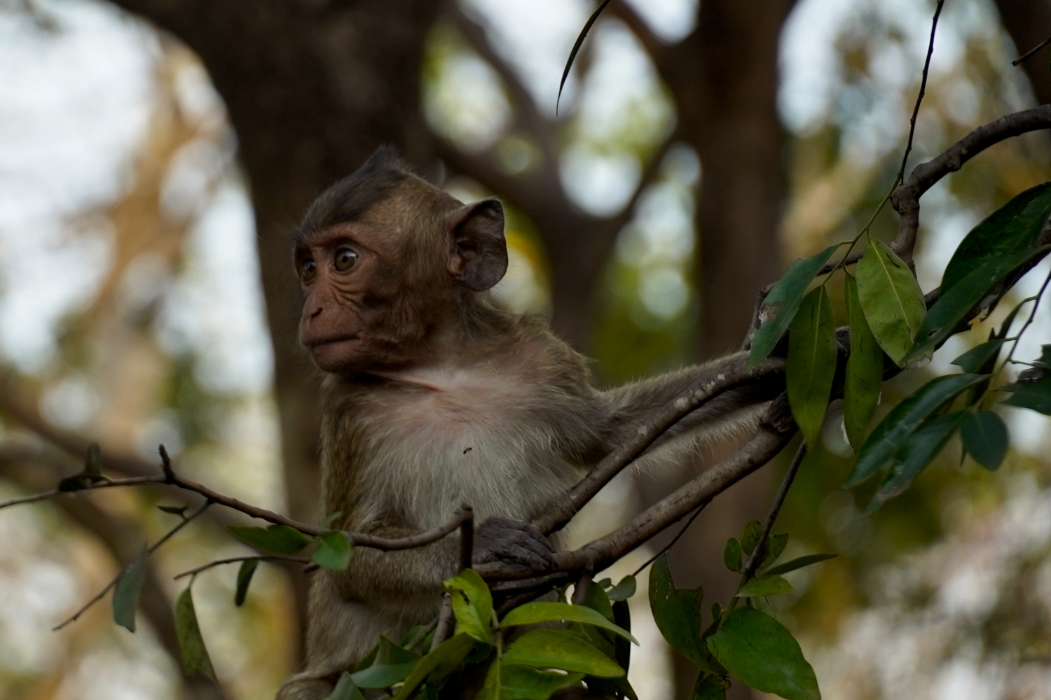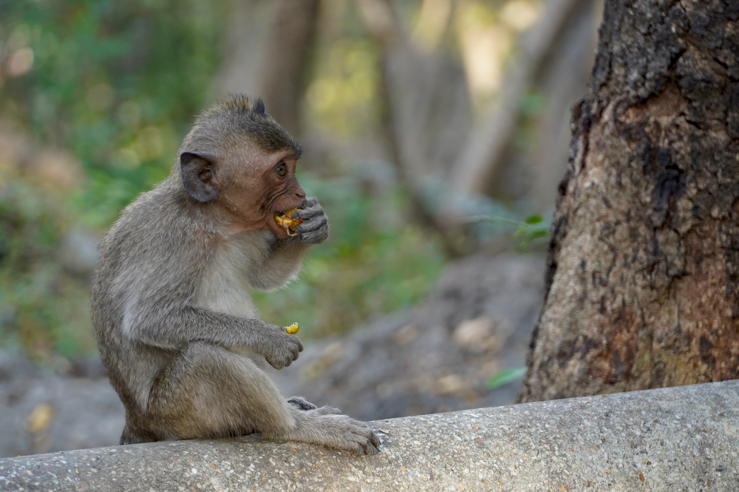 No sooner had we begun opening our bag than suddenly, we had company, in the form of about a dozen little furballs. They inched toward us cautiously, then more brazenly and insistently, until they reached a distance of about 10 feet (or to Cambodian monkeys: 3.048 meters), then they apparently decided they’d tested the limits far enough, and stopped to turn on the cute. Ultimately, we relented and threw a couple of chips their way, whereupon they discarded all decorum and scrambled after them like football players. Looks like we made some friends.
