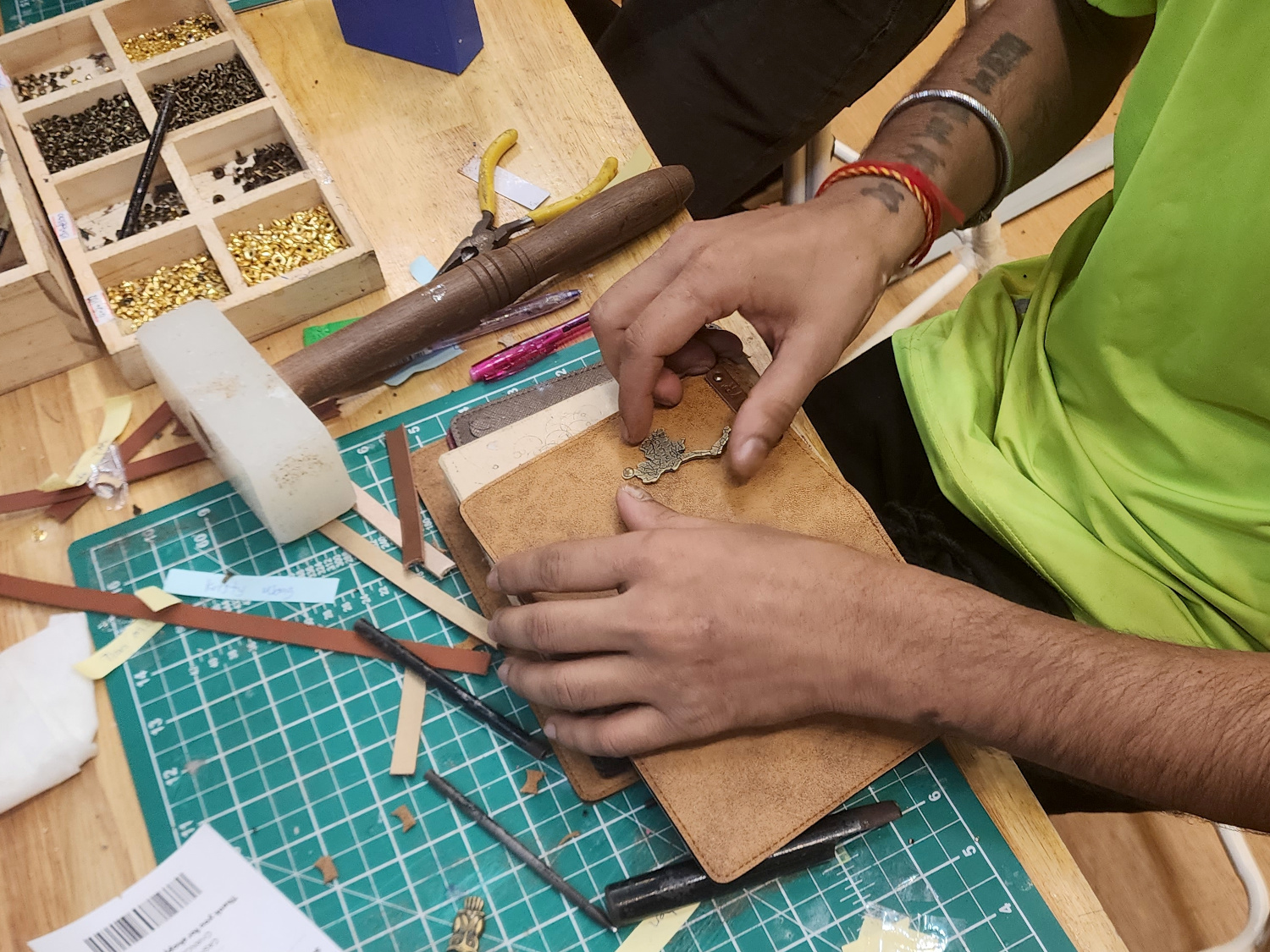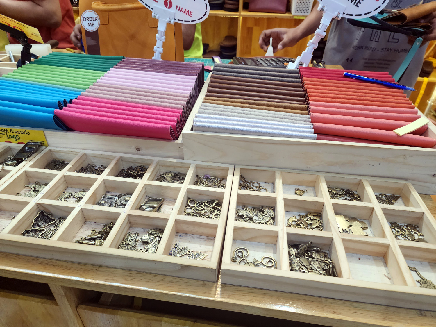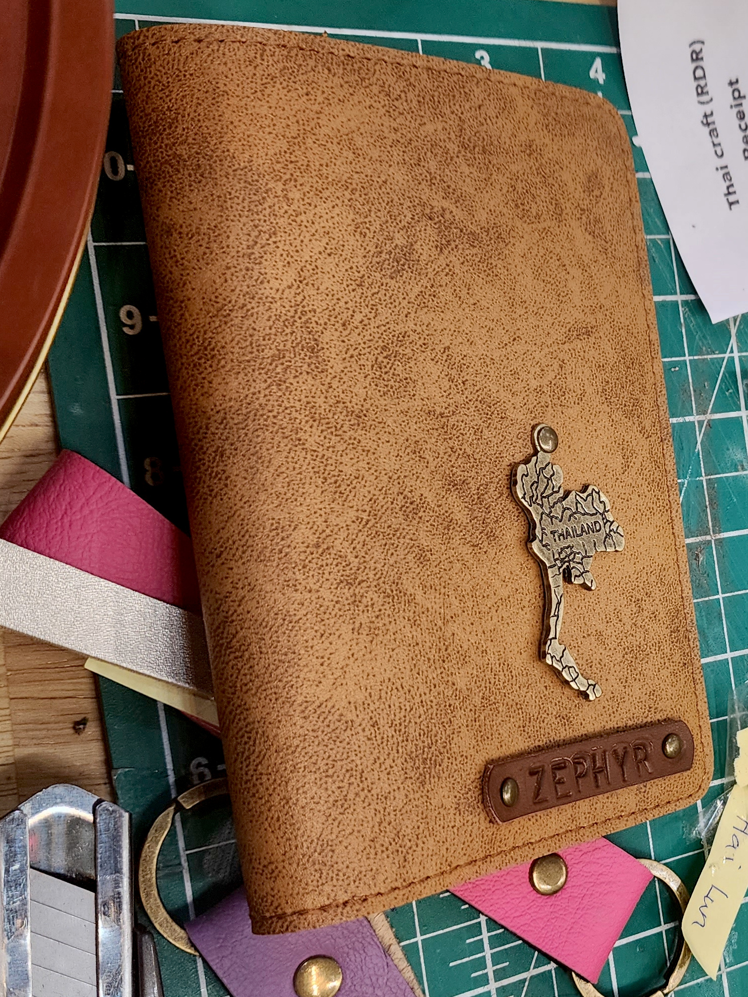 After looking in a number of shops, we were still scratching our heads over what to take them, with the clock ticking away furiously. And then we stumbled upon an inconspicuous little shop that sells personalized leather items — purses, wallets, passport covers, book covers, etc. — and also feature a piece of bling of the customer’s choice, including some that commemorate Thailand or Bangkok. So we had items made to order with our friends’ names on them and, while we were at it, had a gift personalized for our son, Zephyr.