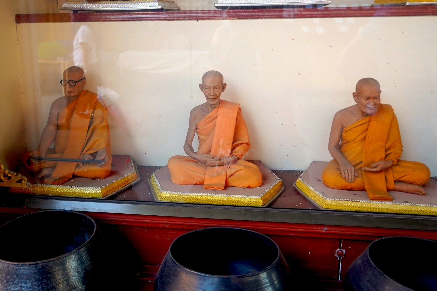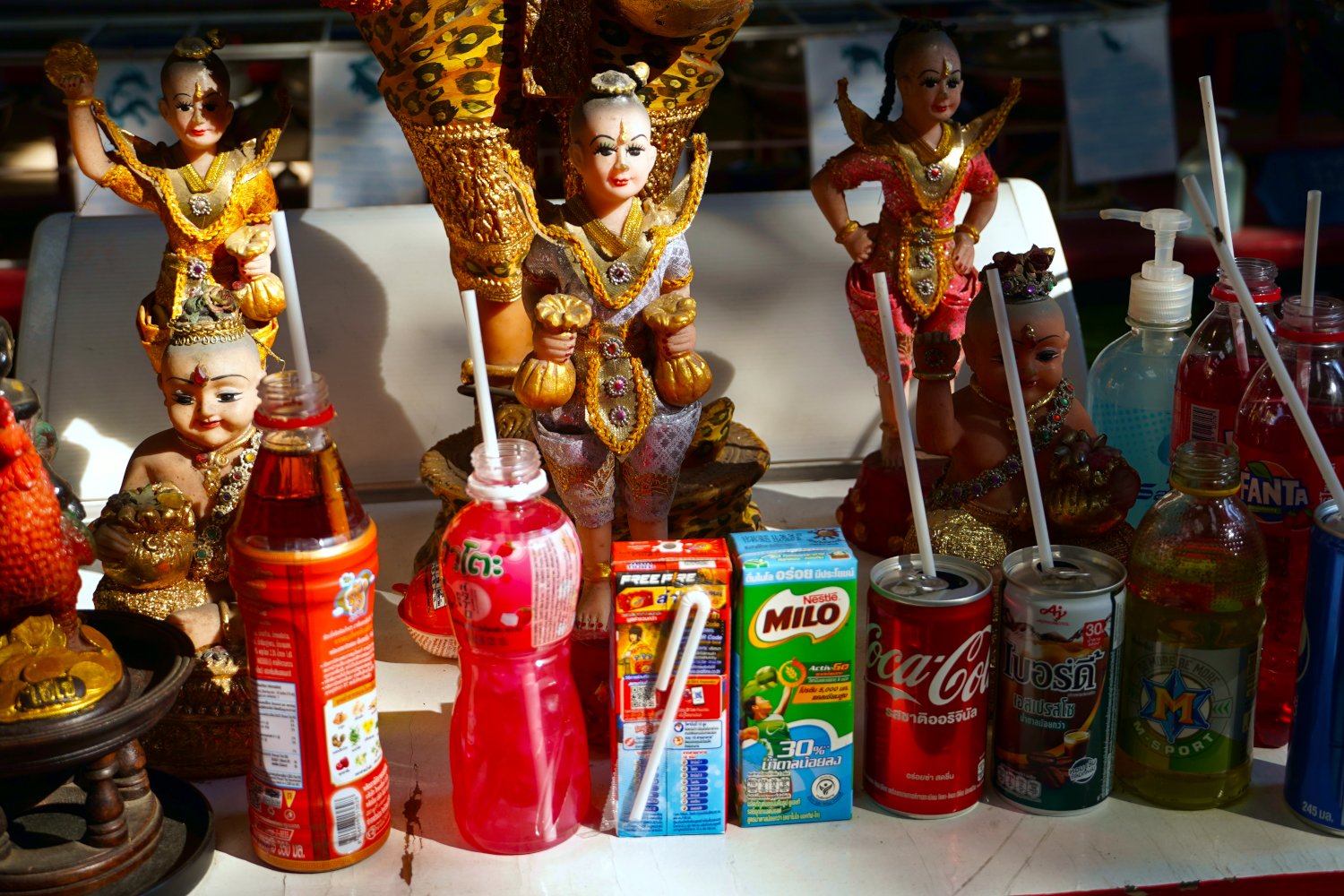 One thing we did was take a little tour of a temple that was near us, and which was open to the public free of charge (though of course donations are always welcomed). It always amazes us to see how people leave offerings of food and drink to the spirits — who apparently have acquired some rather modernized tastes.