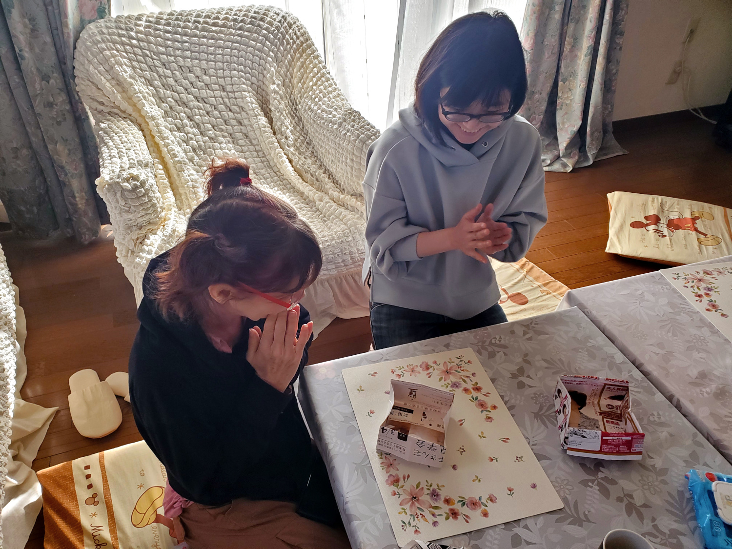 Then it was time for origami class. Ayaka, the grownup daughter, taught us how to fold paper to make a sturdy little box from newspaper. That was an easy initiation — the shapes would become much more challenging later.