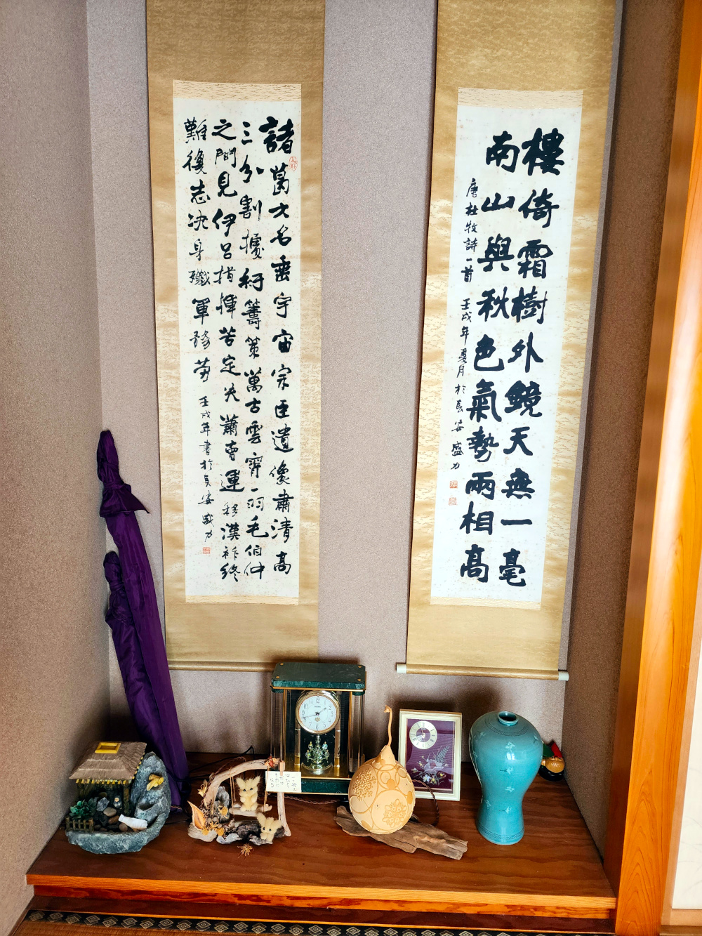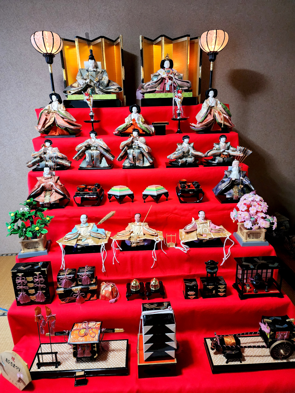 Toshihide, the father, brought out the display items packed in boxes. This included the stand that everything was to be placed on — much assembly required. Fortunately, the box containing the puzzle pieces of the stand included instructions, so between the three of us, we were able to successfully complete the mission of reconstituting it. Then it was covered with the traditional velvety red cloth, and was ready to have the featured pieces placed upon it.