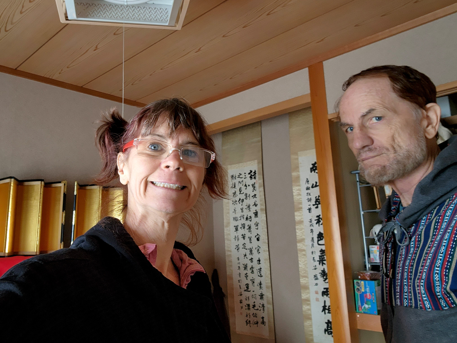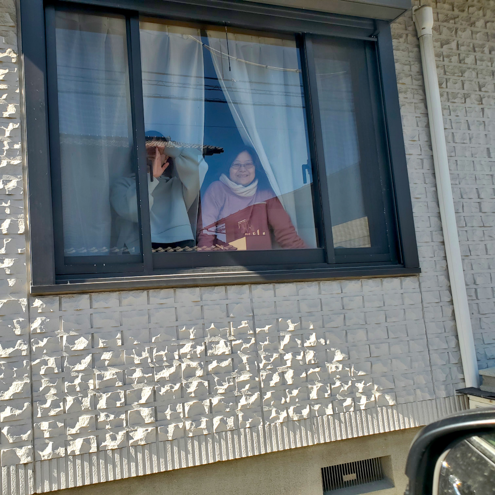 (In the photo of Ayaka and Yukari watching us leave through the window, Ayaka is hearkening back to our first visit many years earlier. At that time we’d watched an episode of a particular TV series, a historical comedy, in which one character believed he could make himself invisible by making a “T” sign with his hands. Naturally, being incurable theatre folk, we couldn’t resist turning the gesture into a running gag.)