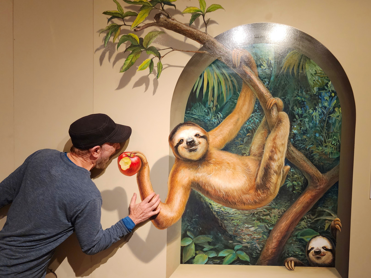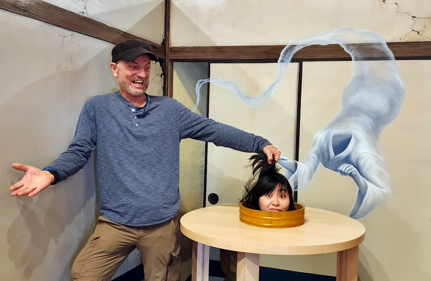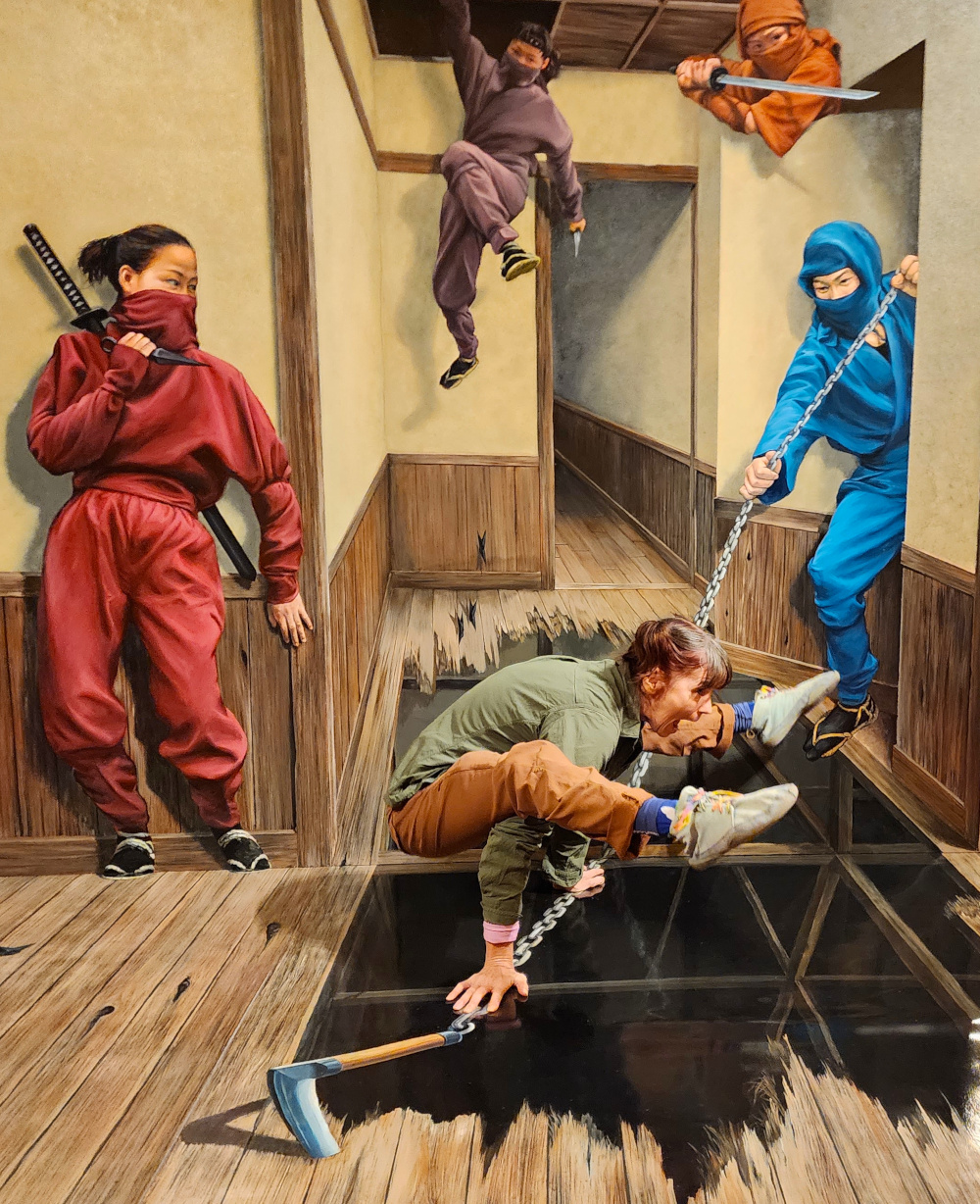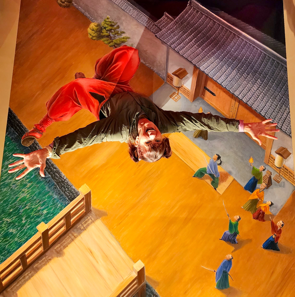 Then it was on to the museum, which was what you might call a gallery of “trick art” — because all the exhibits seemed designed to fool your eyes. You could also call it immersive, interactive, and 3-D, because it was all of those things. Each work of art would incorporate an actual 3-D object (a barrel, a table, an opening in the wall, etc.), and the painting constructed around it would appear very convincingly 3-D itself. As a result, you could place yourself in the scene, and appear to be climbing a wall, fighting another figure, falling from a rooftop, etc. An extremely well done and unforgettable installation.