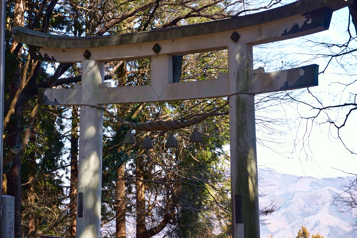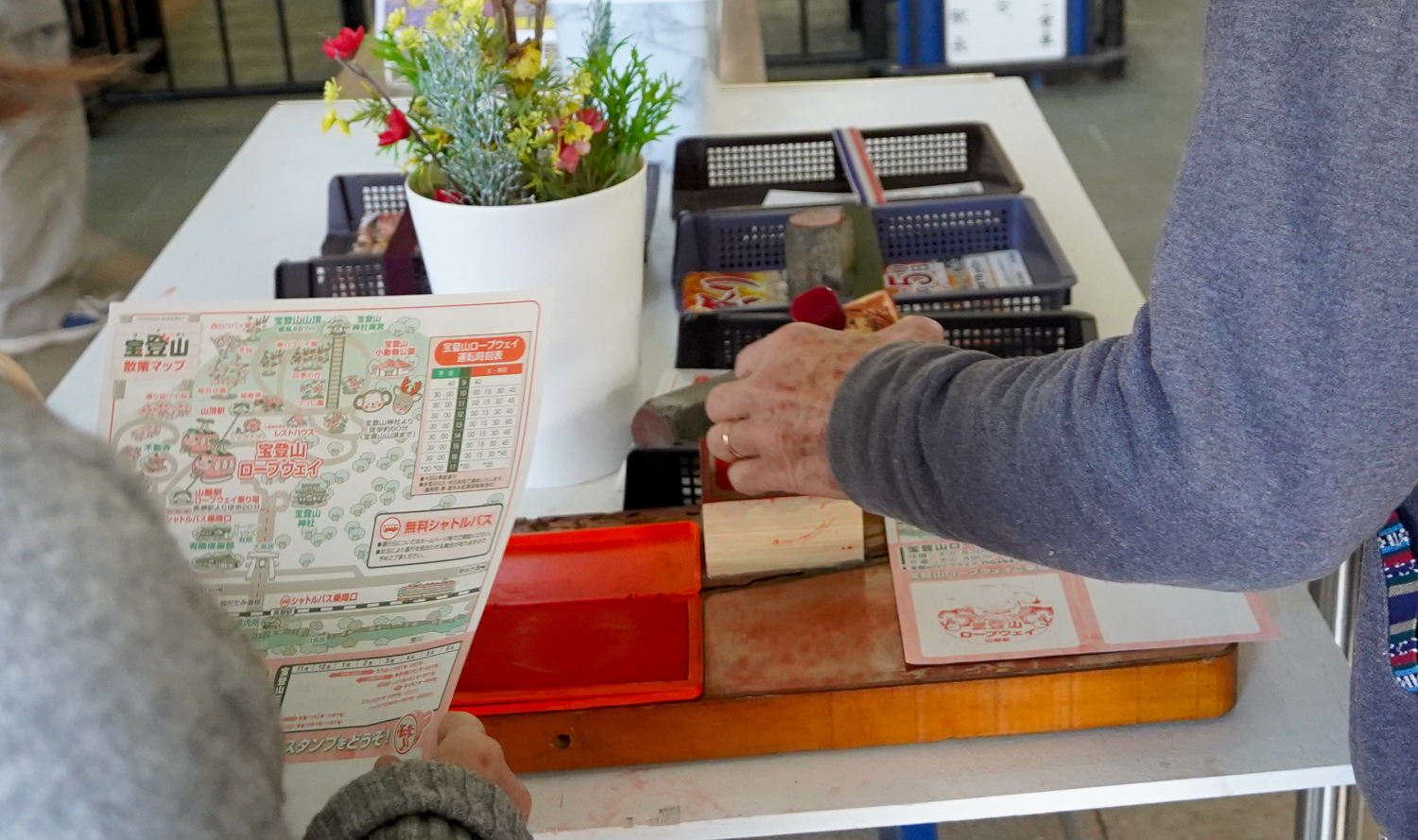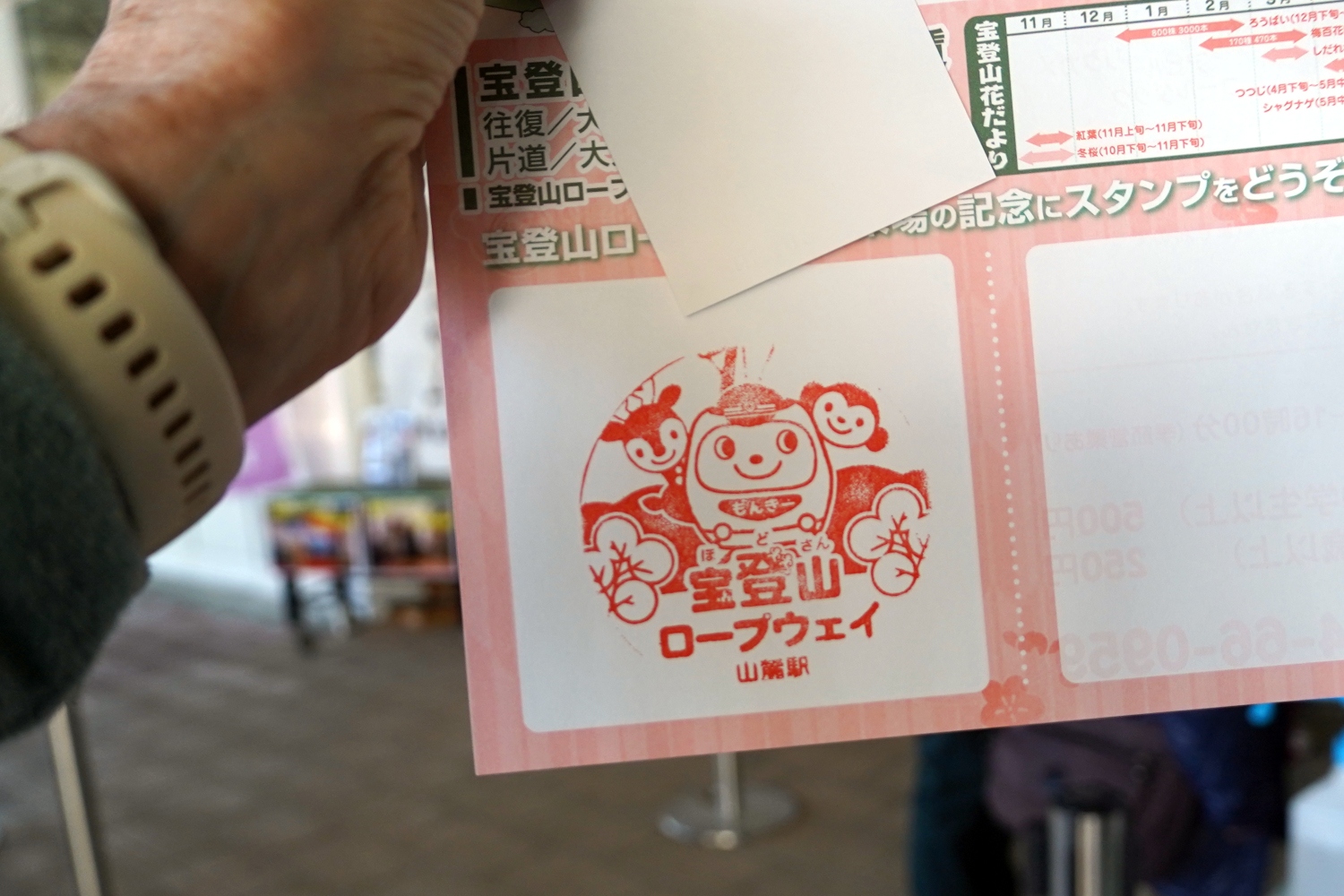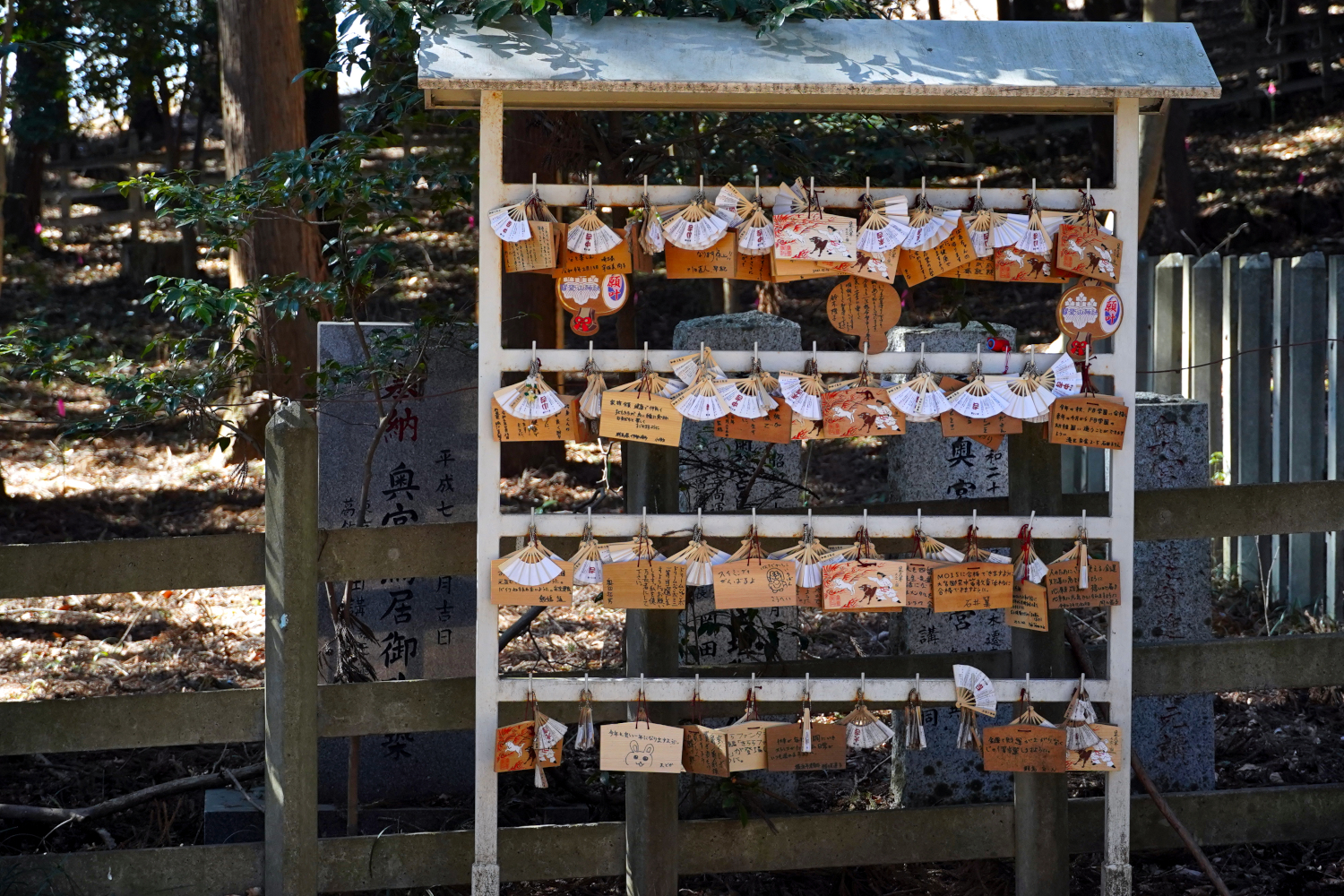 Next was a ride on a nearby tramway, called the Hodosan Ropeway, to the top of the nearby mountain, — or near the top; we had to do a bit of hiking to go the rest of the way. The summit offers some superb views of the mountains, the village and the river. And at the summit is a little Shinto shrine, at the front of which is a rack of little wooden tablets called ema containing prayers and wishes that visitors can hang up.
