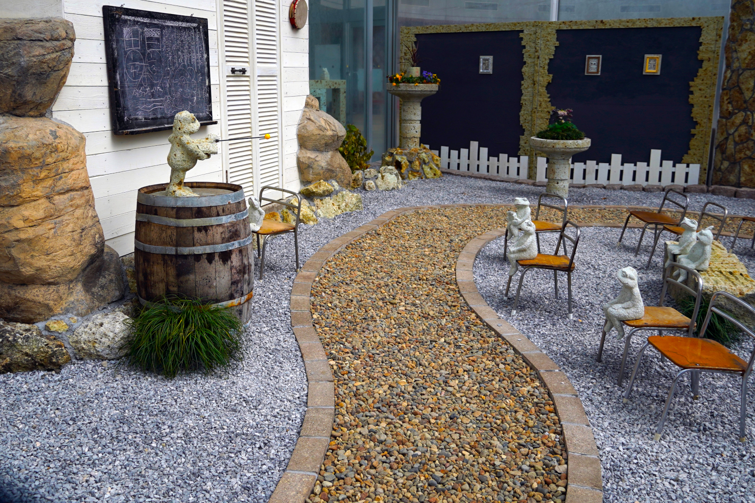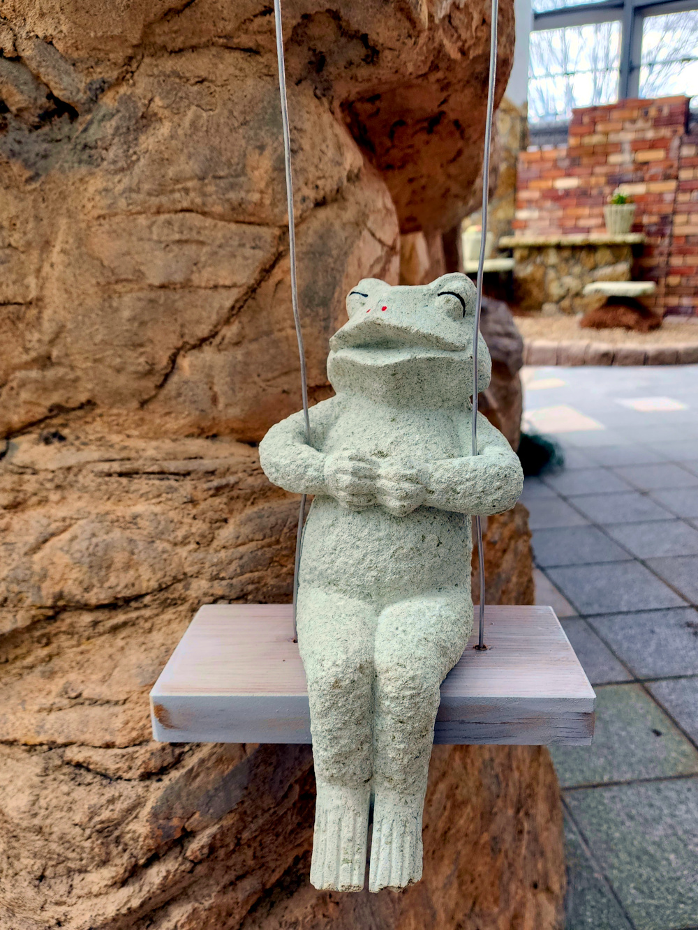 After setting out on a rather lengthy drive with our hosts, we stopped for lunch, then went across the street to another curious attraction: an indoor garden with a number of little rock sculptures in a variety of action poses: swinging on a swing, climbing a rope, playing games, etc.