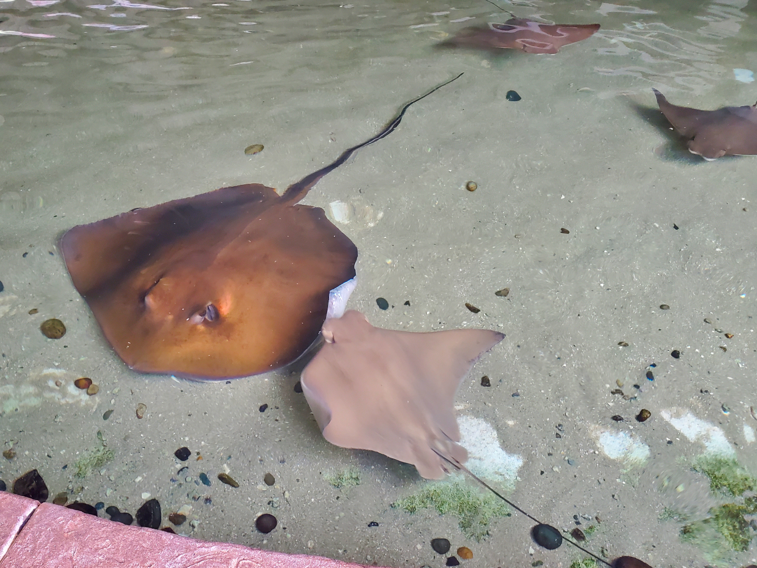 There is an additional charge, for whatever reason, to visit the little pool where the stingrays are located. You can feed and touch these eerie little critters, and it’s perfectly safe, as the stingers have been removed from the rays, Still, Lori was quite skittish about them, and never could quite bring herself to touch them. She got very close a couple of times, but not quite. Entirely understandable, as they do tend to make a person squeamish. The last time we visited a petting zoo with a stingray tank, touching them made Kimberly howl with laughter to such an extent that they could hear her in the front office.
