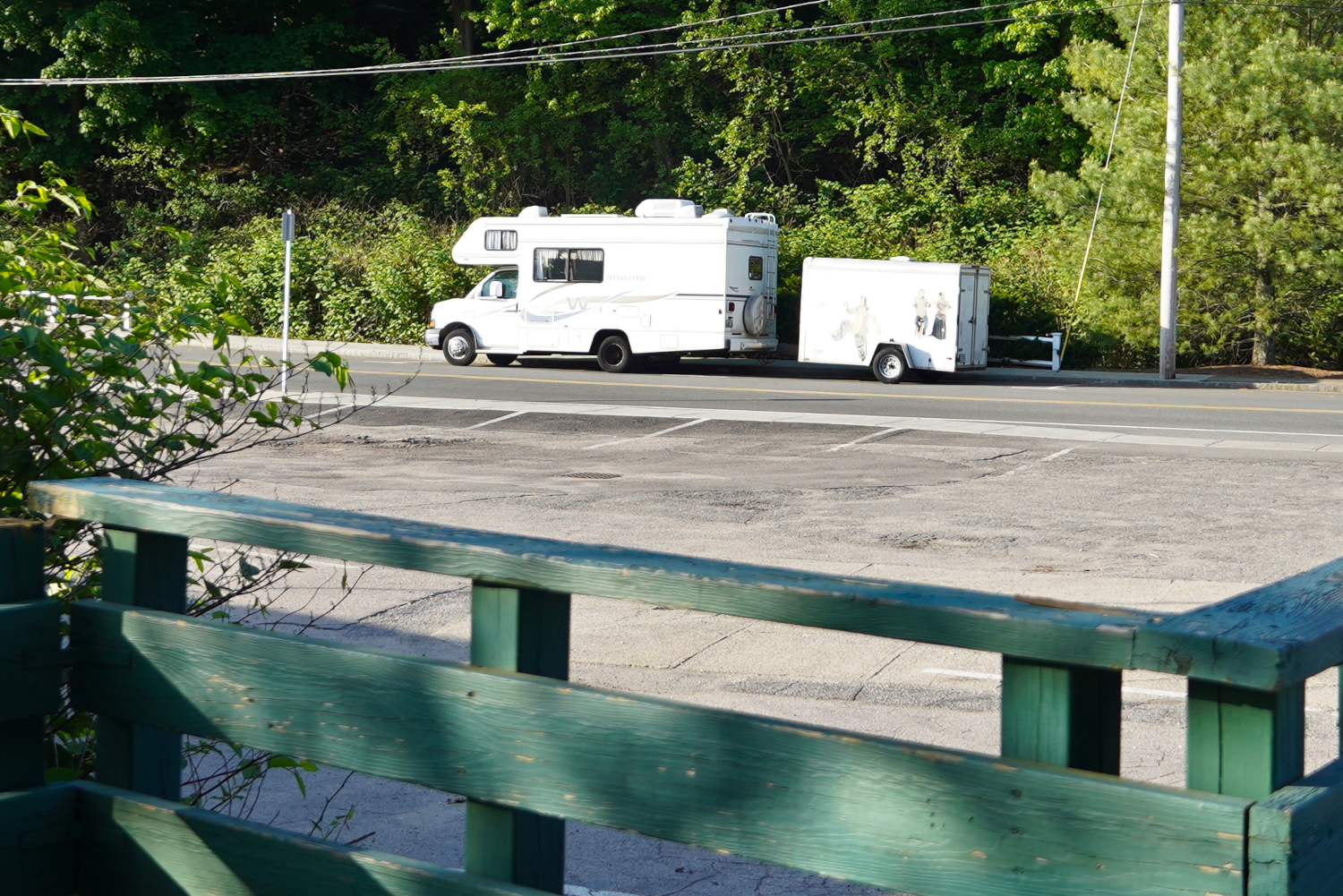 Arriving at the Walpole Lamplighters theatre before anyone else (we’ve learned to do that when driving an RV and pulling a trailer, because otherwise parking might be impossible), we parked in the lot across the street and (something else we learned many years ago), put a sign in the window stating that we were indeed there to see the show, lest someone call the police on us.