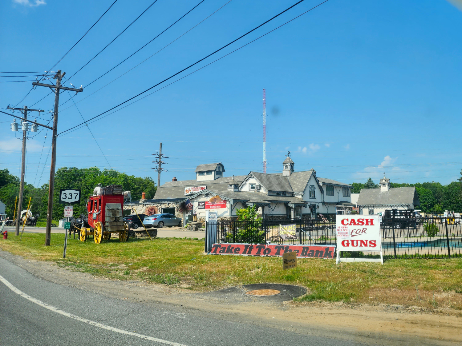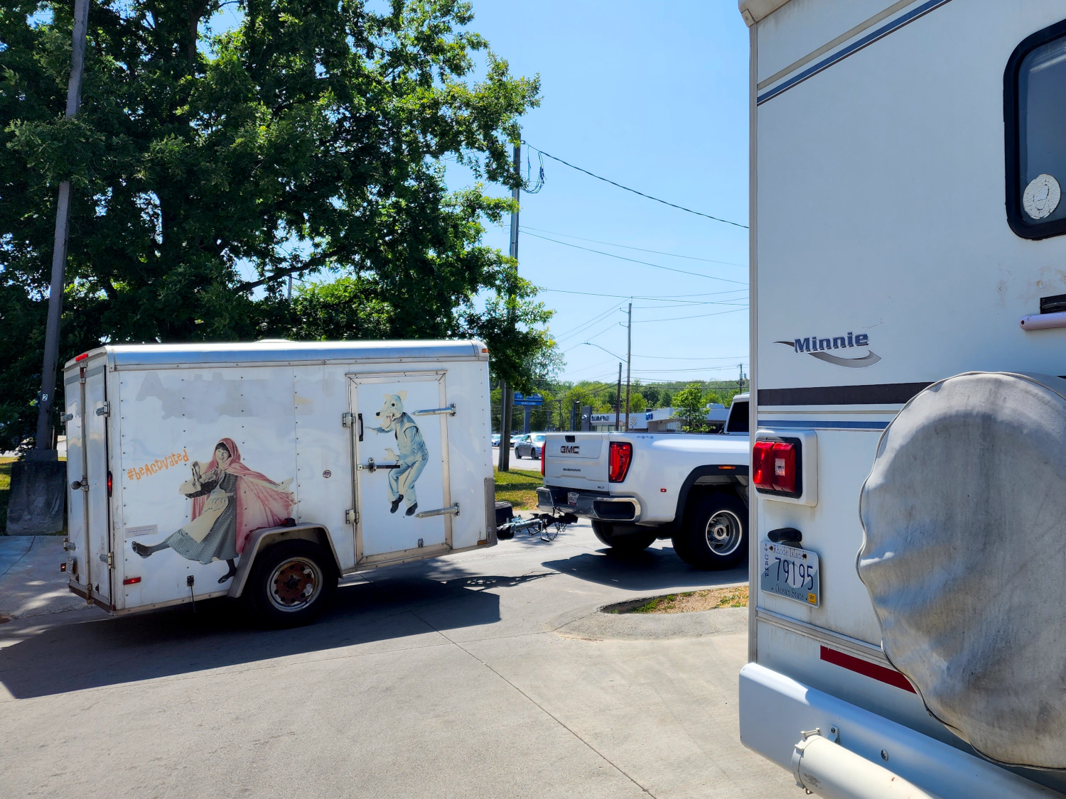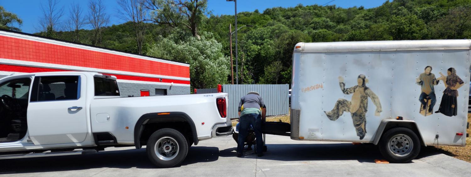 Hitching the trailer to their pickup necessitated a trip to AutoZone to obtain an adaptor for the wiring harness so our trailer’s lights could communicate with their truck’s. And we also had to make some adjustments to the hitch because of the height differential. Finally, after finessing and finagling, we arrived at a satisfactory configuration. The trailer was slanted back noticeably, as if it was bracing to lift up off the pavement and soar into the air. But that was acceptable to get it where it needed to go.