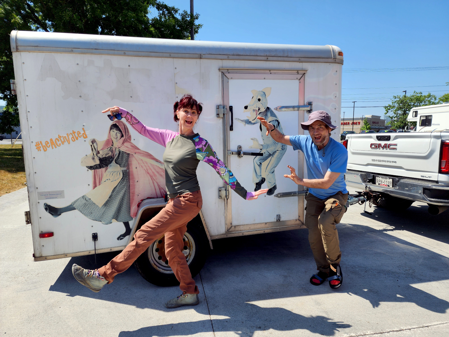 This trailer, like its predecessors, had transported our life as we knew it then all over the country. It was the guardian of the sets and costumes for our theatrical shows, as well as extra clothing, tools and supplies for the RV, and other odds and ends — mostly odds. It was a strange sensation to watch it pull away, with life-size photos of ourselves as Red Riding Hood and the Wolf and other characters on the side, and leave us behind.