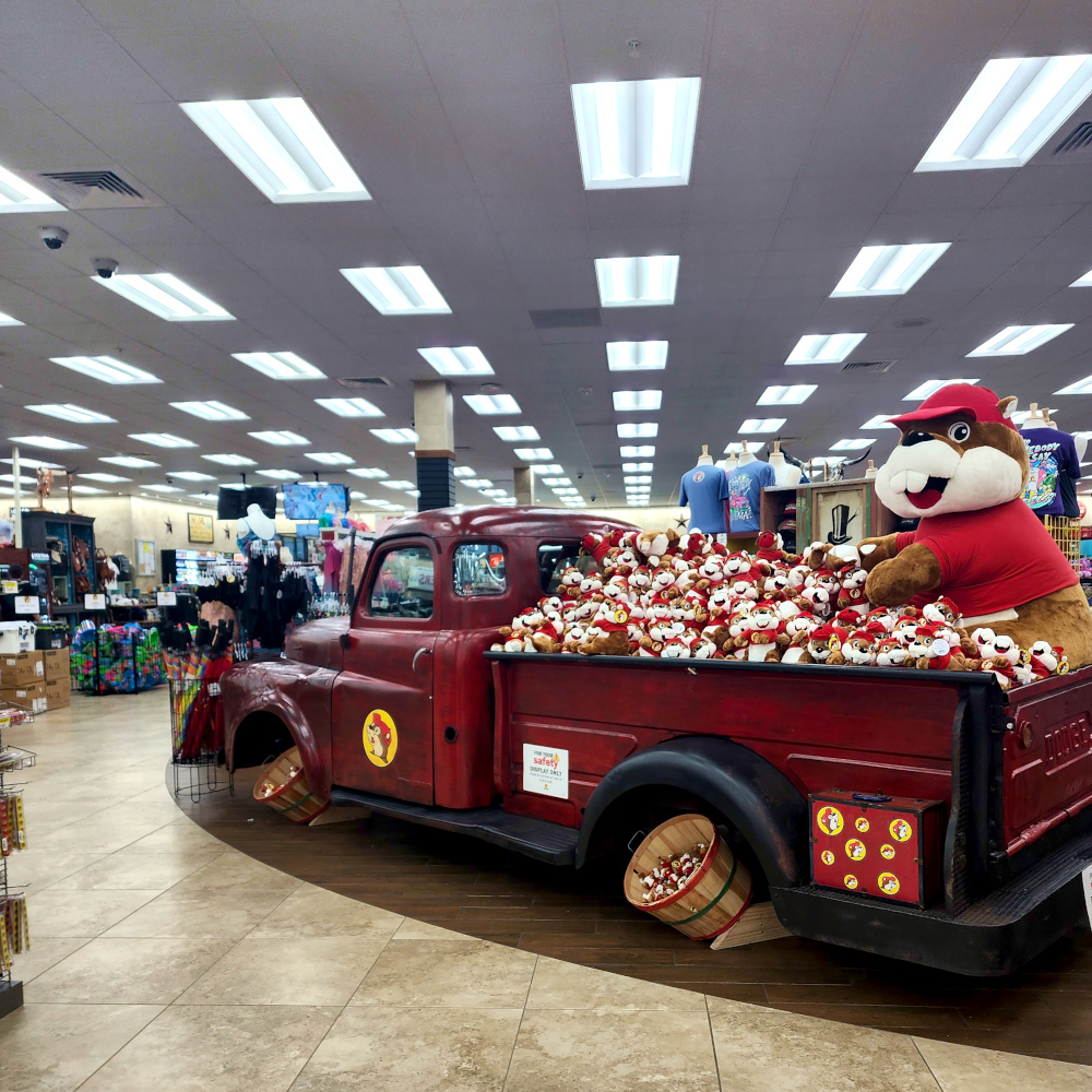 After leaving Knoxville, we continued with our westward ho trajectory, passing through Jackson, Memphis, and other Tennessee cities. In Crossville, we made a fuel stop at Buc-ee’s, a decidedly idiosyncratic chain of gas stations and shopping/ restaurant centers (mostly in Texas). It’s one of the rare fuel stops that actually make buying gas, and browsing in the store, a fun experience. Founded in 1982 in Texas, it began expanding into other states only in 2018.