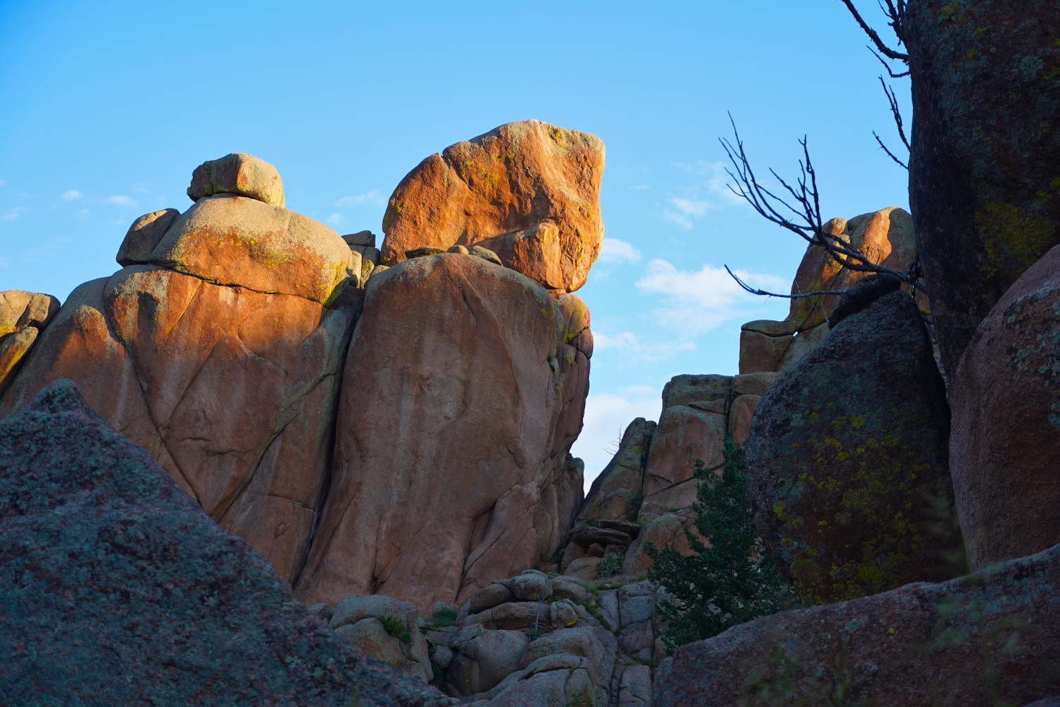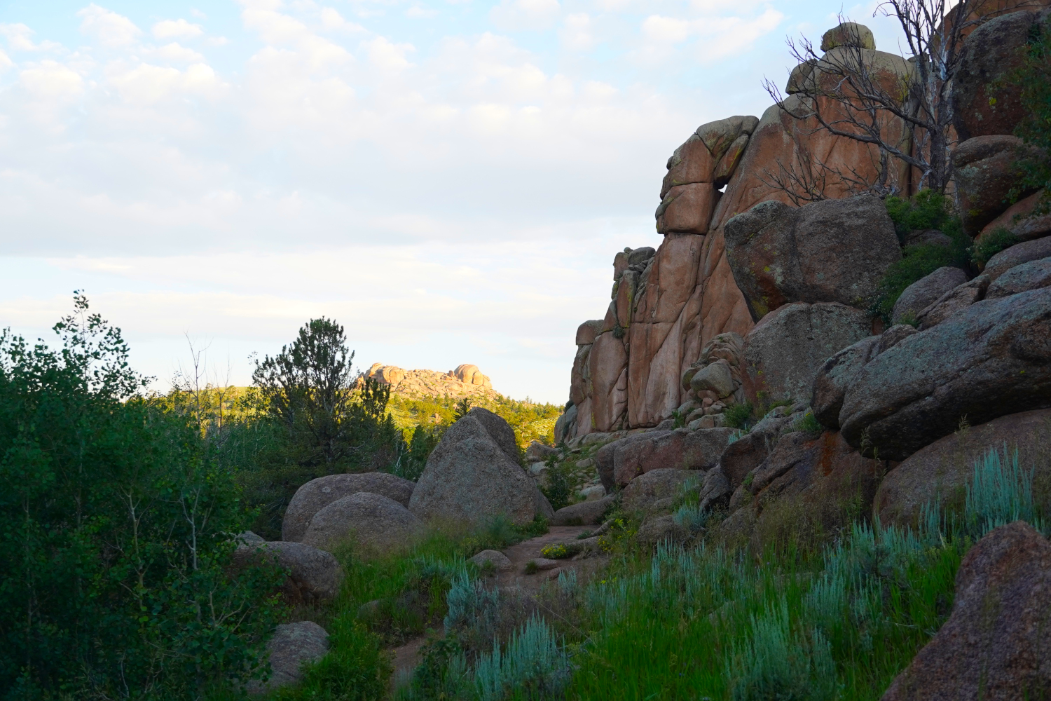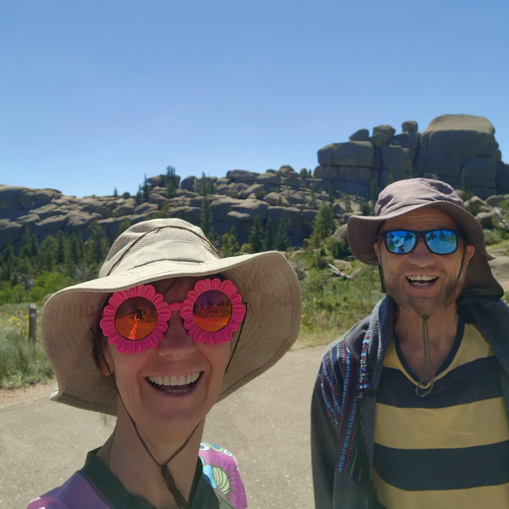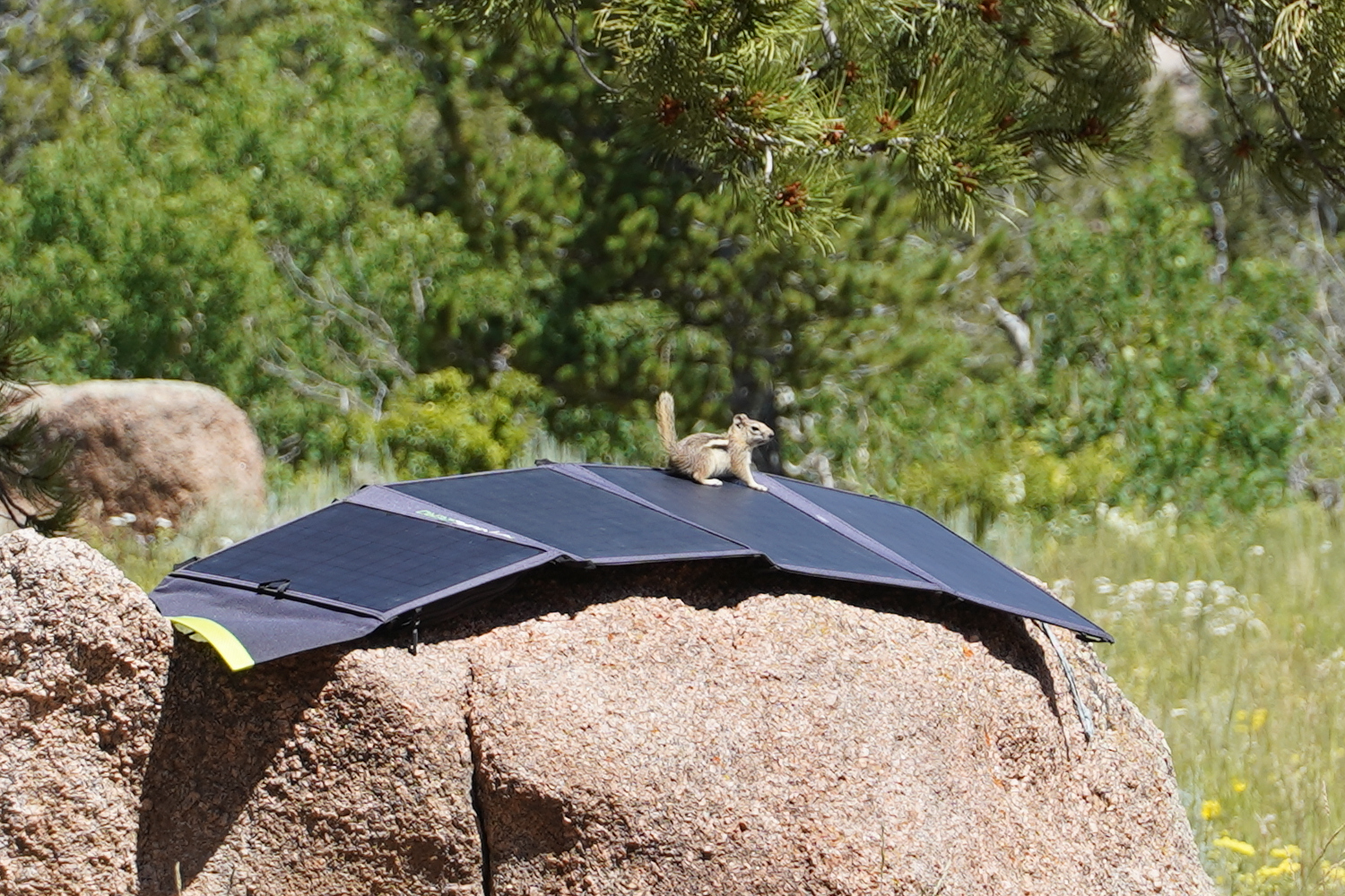 We holed up for a couple of nights near Laramie, at Curt Gowdy State Park (named after a distinguished TV sportscaster who was a Wyoming native). There was no electricity, but we spread out our portable fold-up solar panel (which became a hangout spot for some of the little critters). Kimberly stretched out her beloved slackline, and practiced some circus skills.