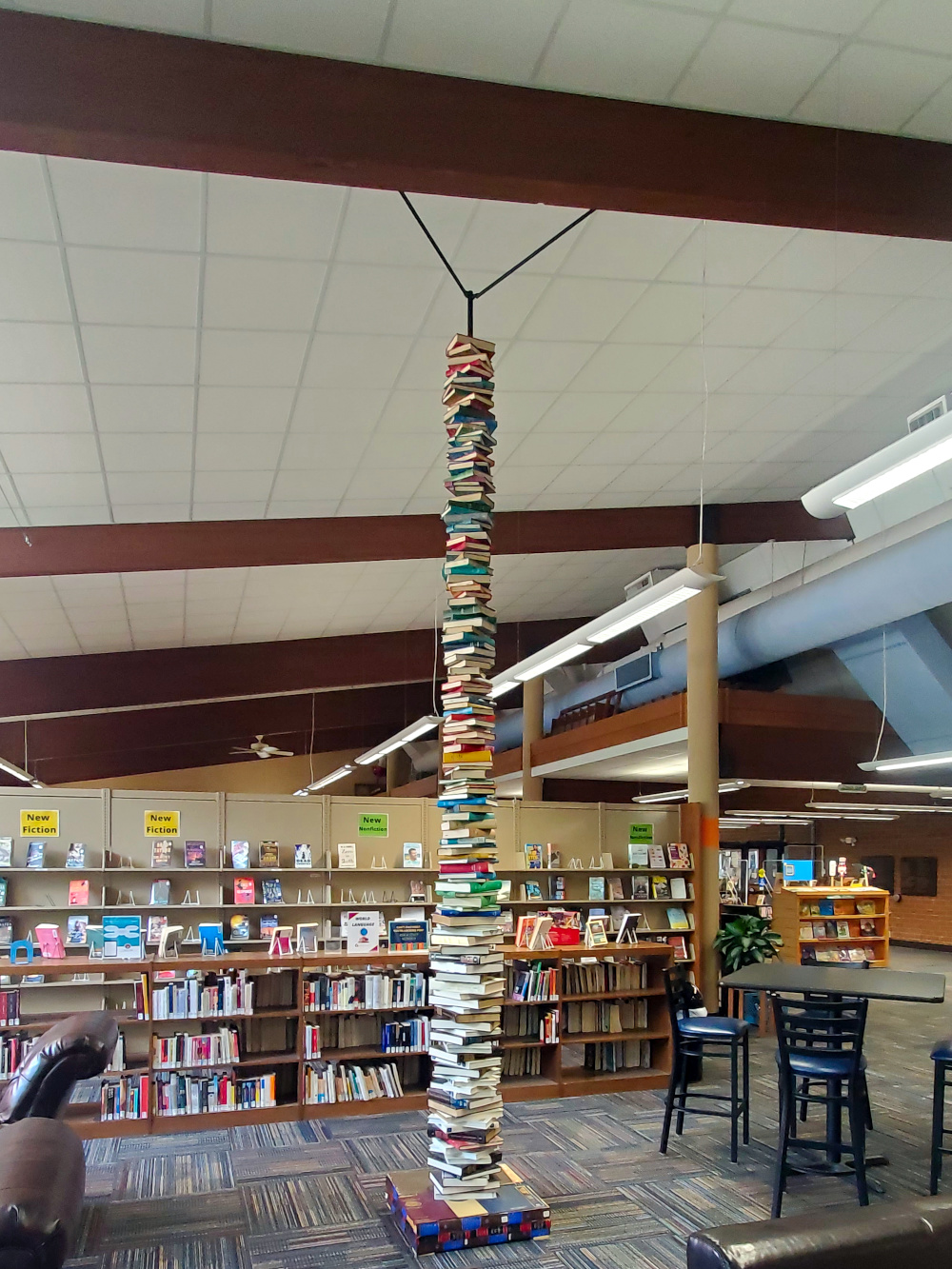 After a couple of days of being off-grid in the park, we headed on into Laramie to hang out at the library, taking advantage of its wi-fi to do some computer work. The Laramie Library had a distinctive piece of signature decor in the form of a stack of books, suspended form the ceiling, to which it almost reached.