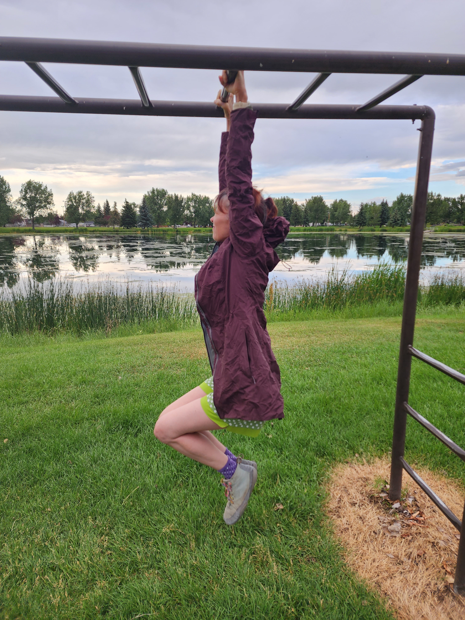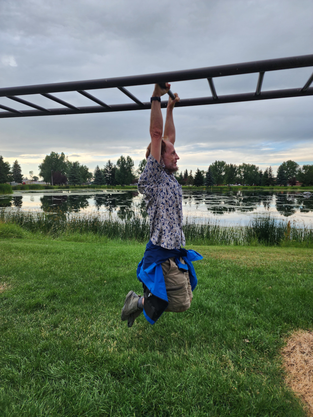 Later, taking a walk around town, we tried some suspending (suspense?) of our own. We’d also read recently that the ability to hang from bars by your hands is an indicator of expected longevity. And for our… er…. chronological demographic, one should be able to hang for two minutes. Well, we gave it our best shot, and could manage only a minute and a half. Still, not too shabby, and we feel confident we can work up to the target.
