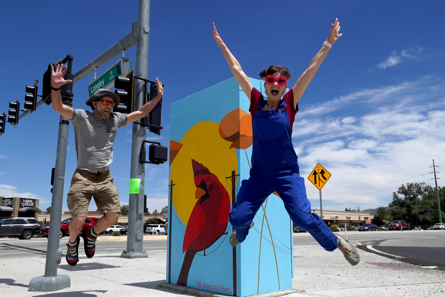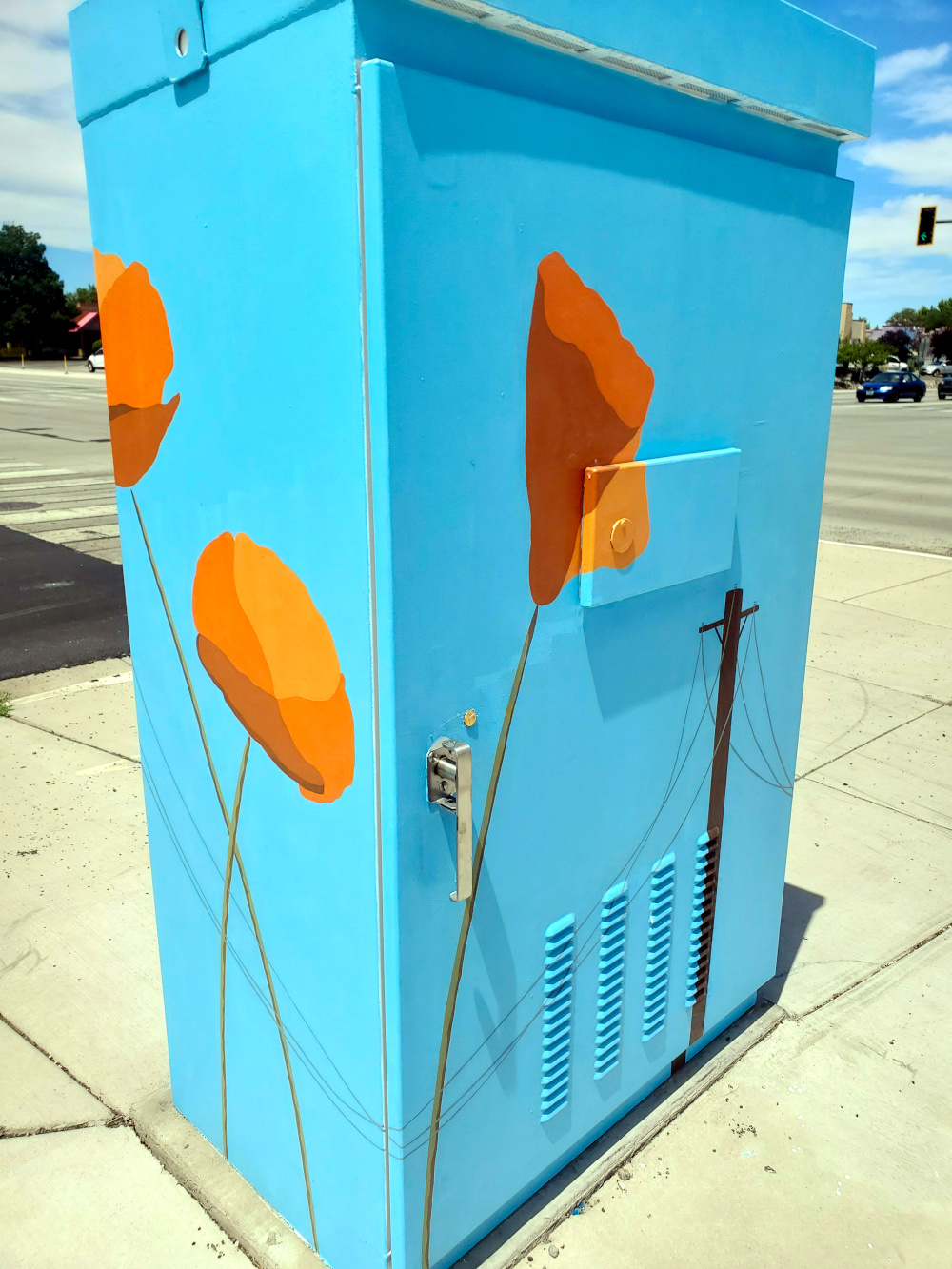 But we also had more time than we ever did in past years to get out and about in Reno. And one thing we had to do was go to a certain corner and check out a certain electrical thingamajig (they’re technically called signal boxes). Because it was beautifully painted by none other than our niece Jenny, a gifted artist. (JennyJustPaints on IG) She was selected as a participant in a program called Art Signals, which offers local artists the chance to put their designs on these signal boxes all around the Reno area. Kudos to the City Of Reno for having the vision to convert mundane objects that were purely functional into works of art — and at the same time providing an opportunity for artists to have their work viewed by a larger public. (In a similar vein, we just learned that the city of Bogota, Colombia, which we visited not long ago, replaced all its traffic cops with mimes; whereupon traffic fatalities dropped by 50 percent. And some former traffic cops trained to become mimes themselves. Seriously.)