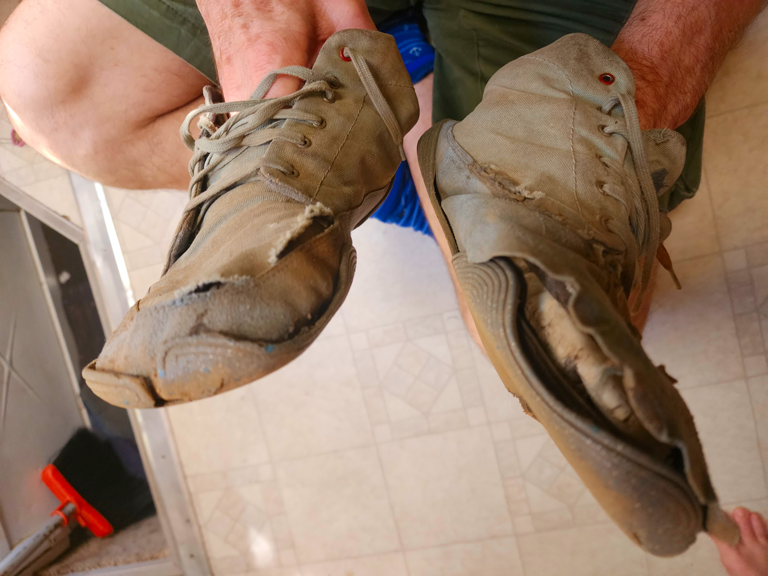 One thing was that Dennis had to ditch his well-worn barefoot shoes. We ordered these online at the beginning of our around-the-world jaunt, and we’ve put many a mile (and kilometer) on them. He’d hung onto his for a ridiculously long time, and finally they had to go.
