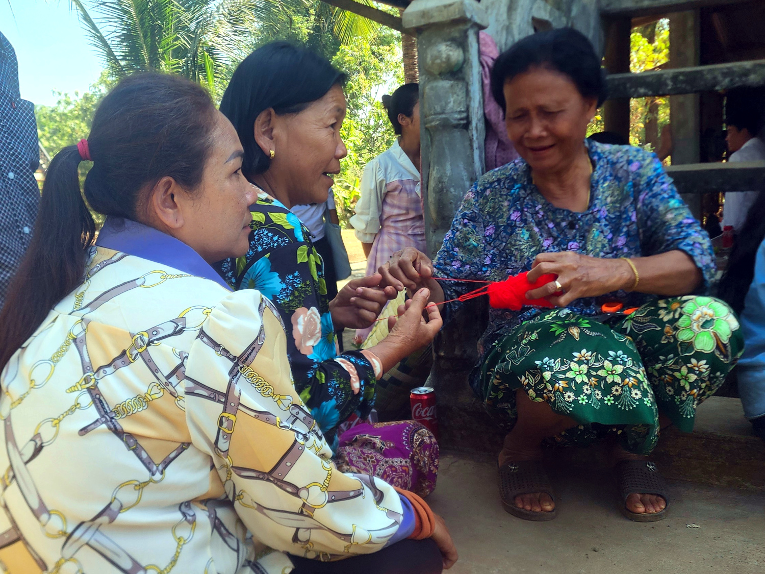 They were seated in elaborate chairs, and the guests (apparently just the married couples according to tradition) took turns approaching them and tying a little red ribbon onto the wrist of each of them. So far so good. But it’s also tradition to slip some money into the groom’s hands. (Some people contributed as much as 100 dollars.) And that was the part we were quite unprepared for.
