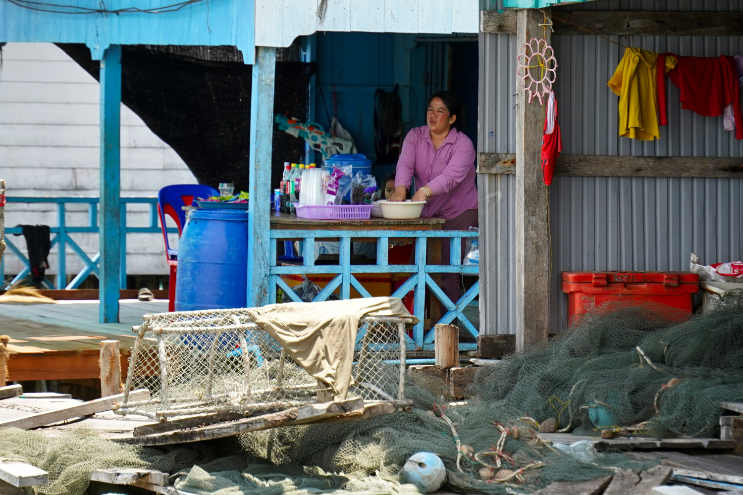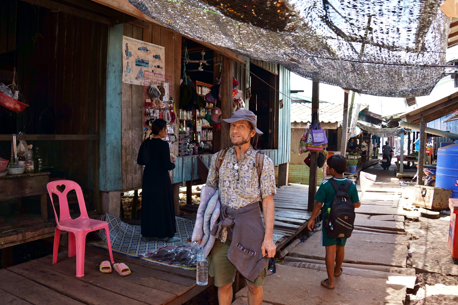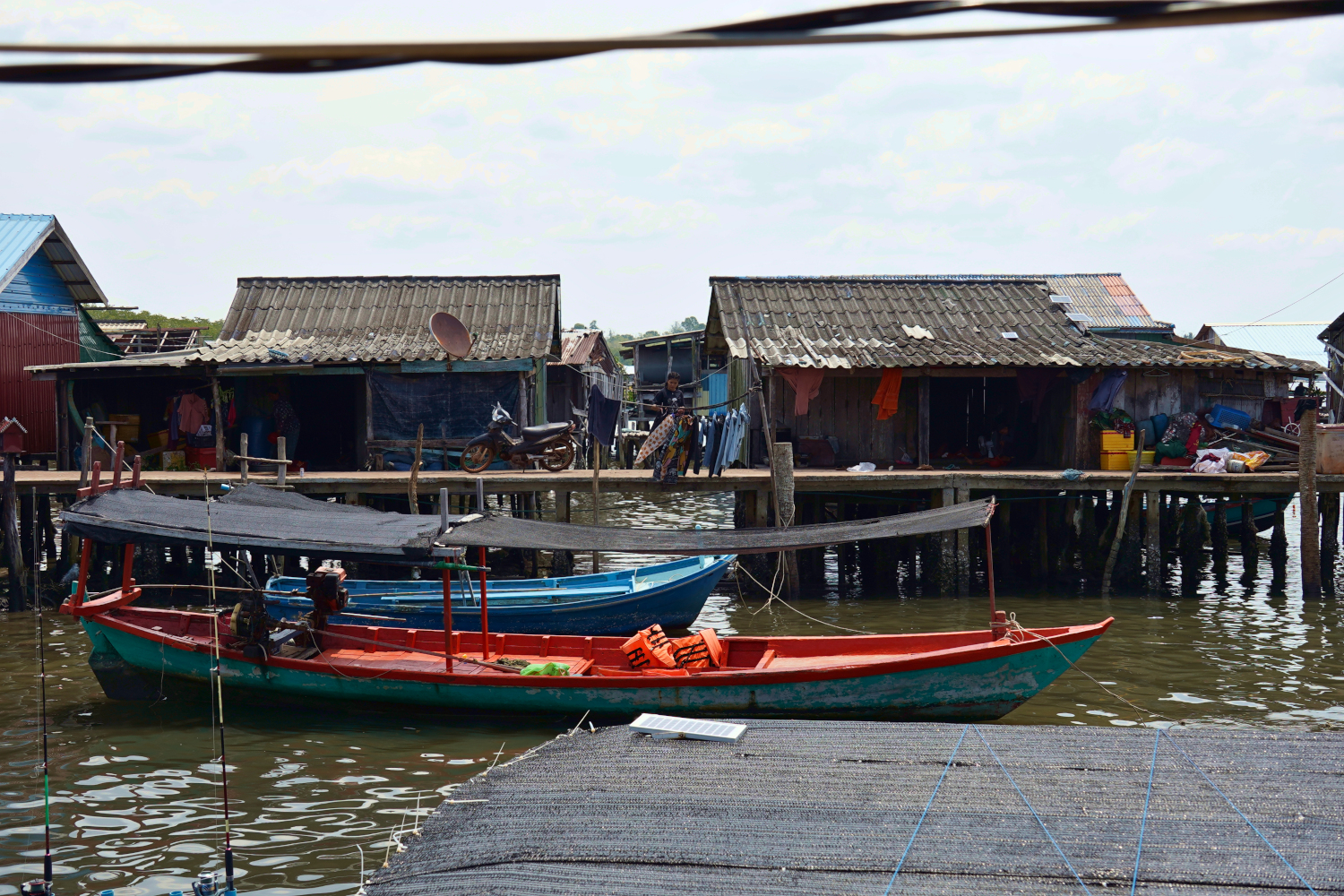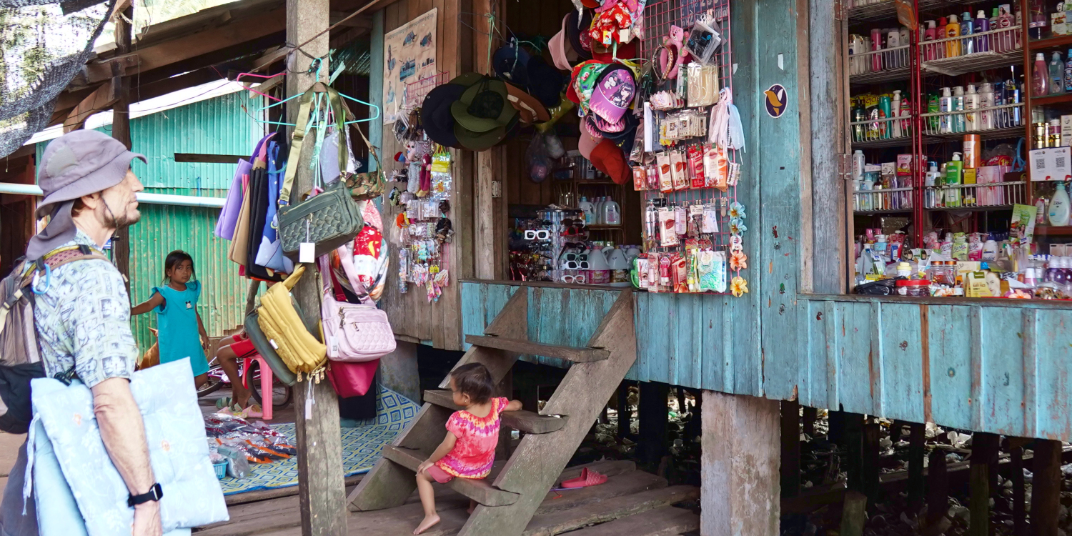 Then we had about a 40-minute ride to a pit stop at the pilot’s home, an open-air house in an antiquated little fishing village on stilts, where the “sidewalks” are simply boards stretched over the water. We felt that we were getting a good taste of the real Cambodia, the traditional Cambodia — except that for all their isolation, the pilot’s kids still played games on their phones like kids everywhere. And they slept in little tents inside the house.