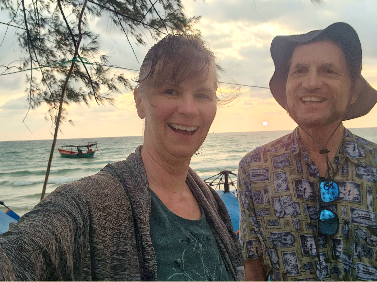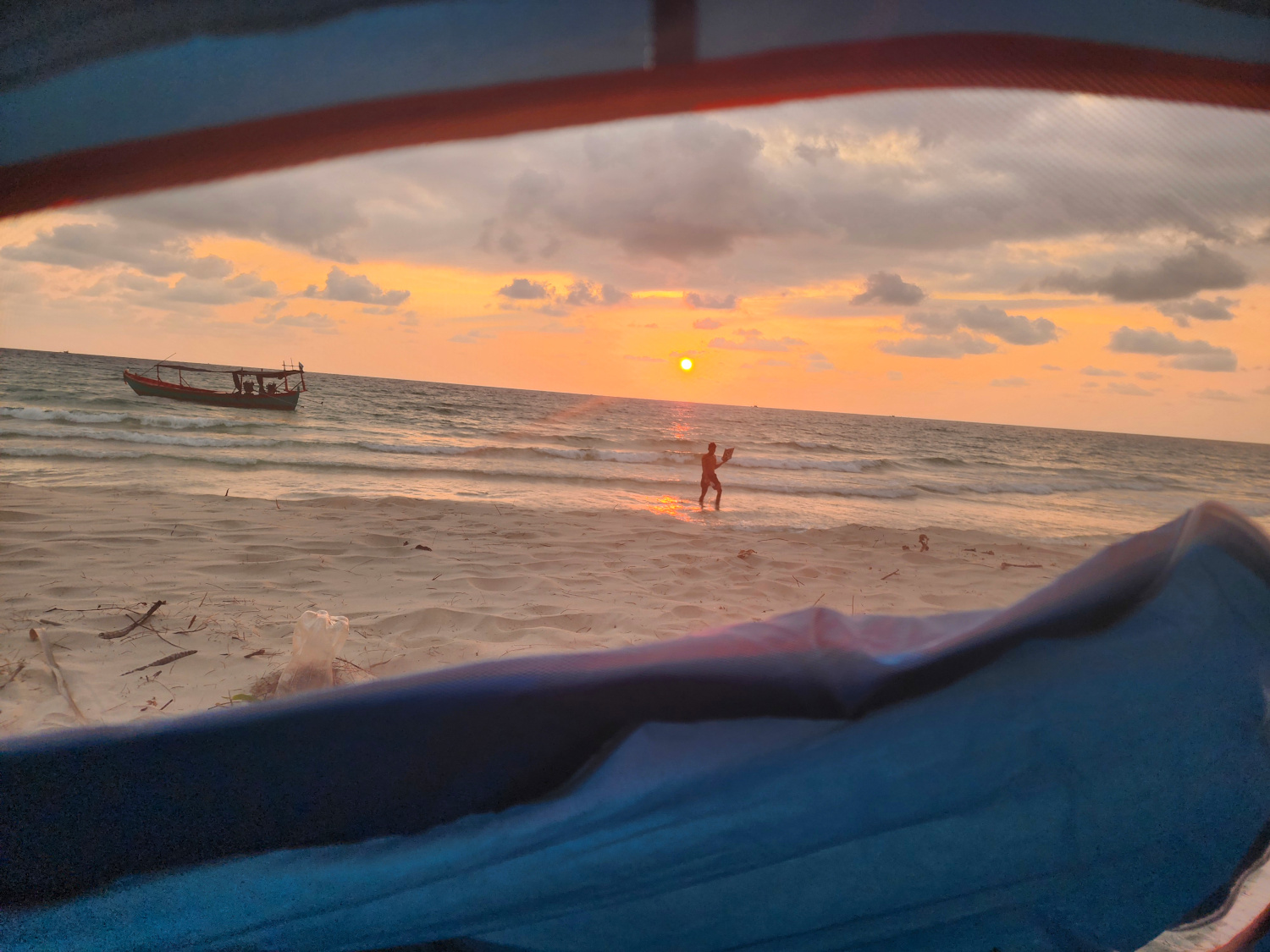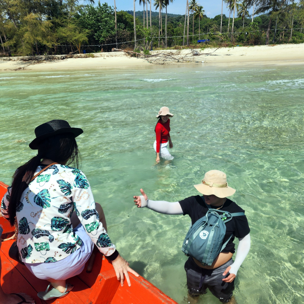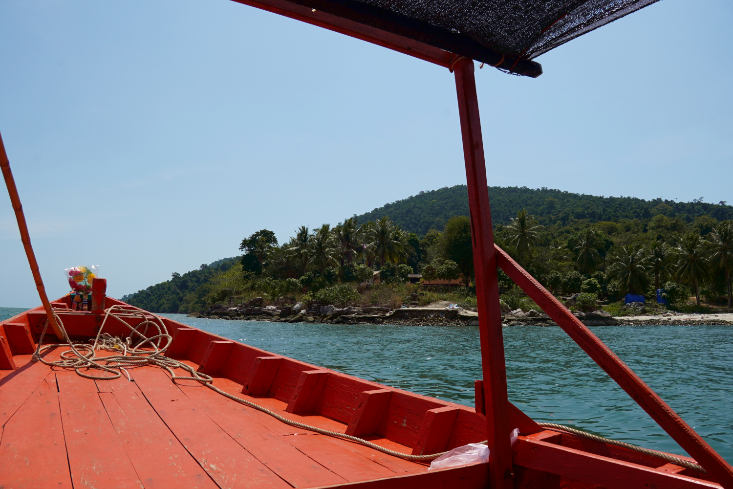 And then it was back into the boat; getting into and out of it required a bit of athletic skill, because there was no ramp, no set of stairs; you just climbed up to get out and hopped down to get back in. Then on for another half hour or so to the island of Koh Kong (“koh” means island) and the beach where we were to camp.