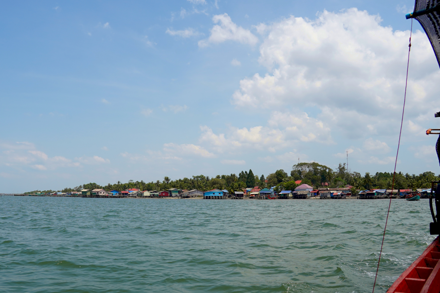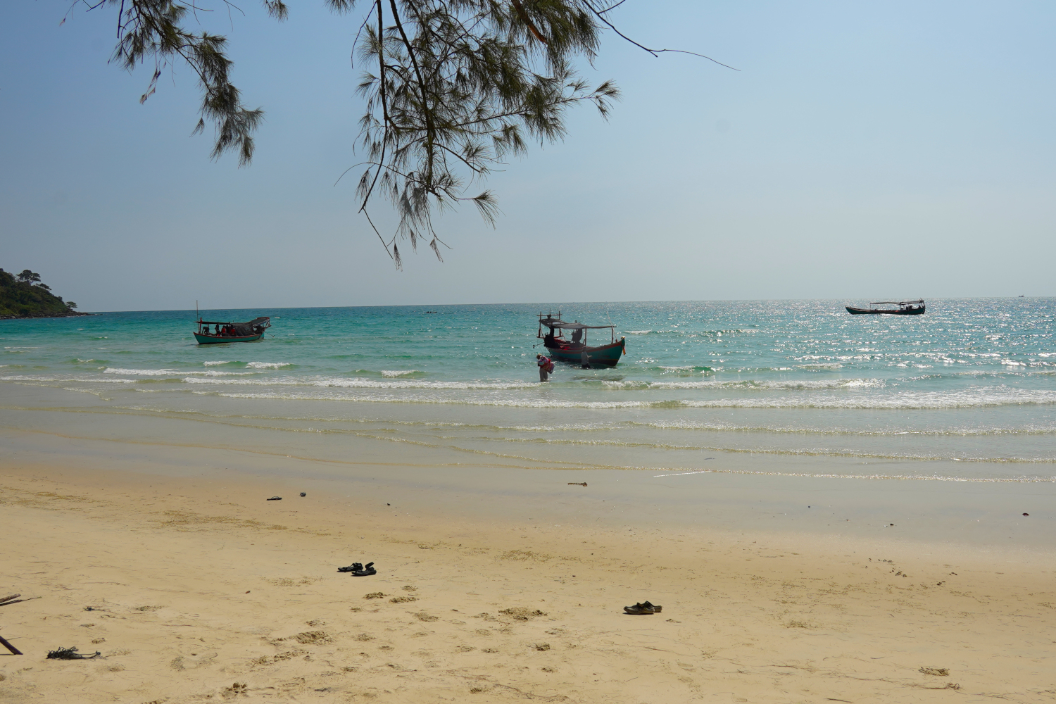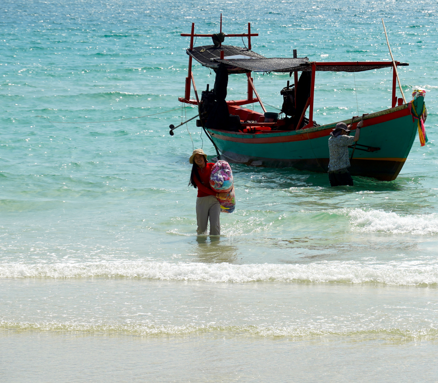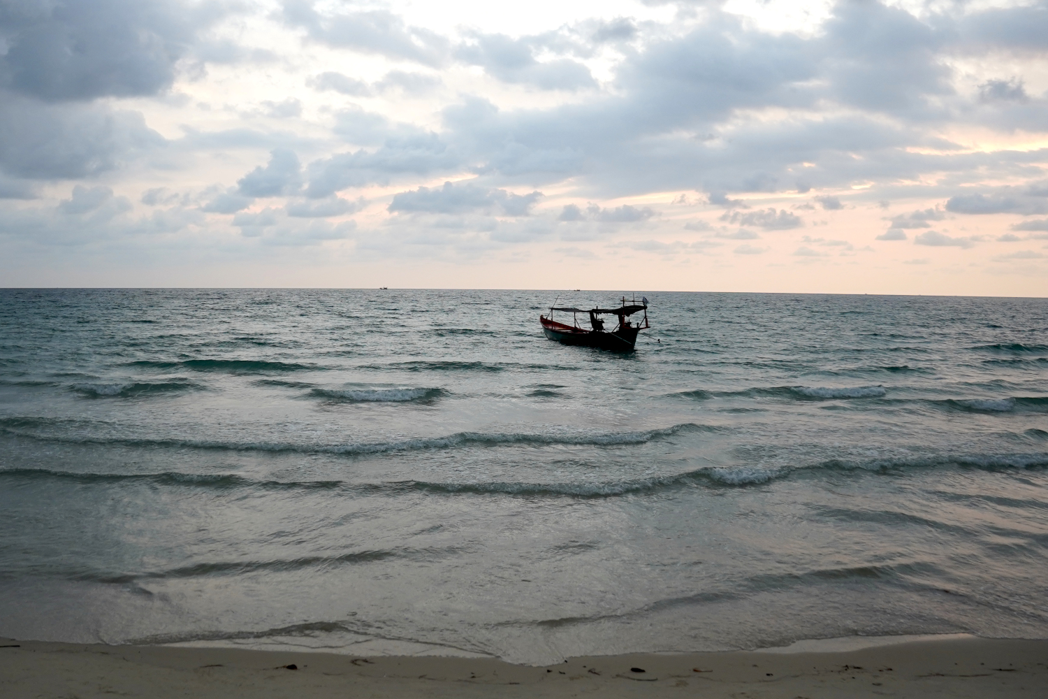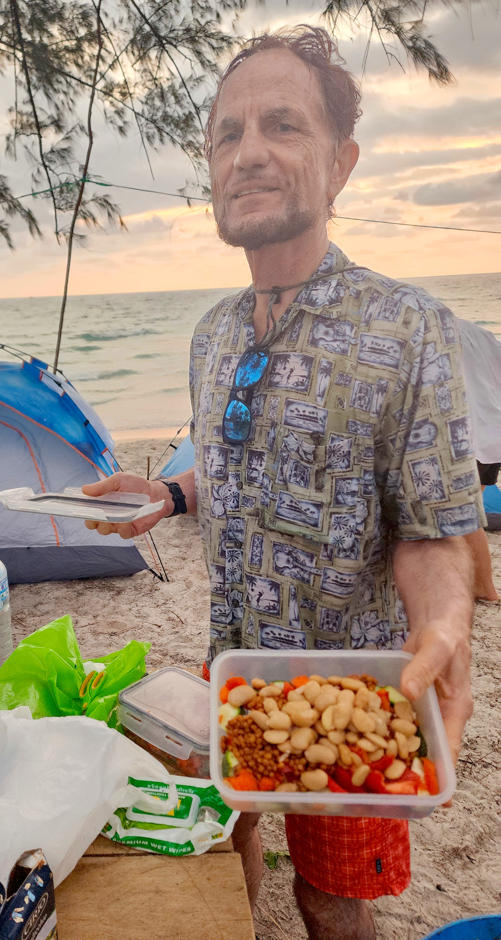 And then it was back into the boat; getting into and out of it required a bit of athletic skill, because there was no ramp, no set of stairs; you just climbed up to get out and hopped down to get back in. Then on for another half hour or so to the island of Koh Kong (“koh” means island) and the beach where we were to camp.