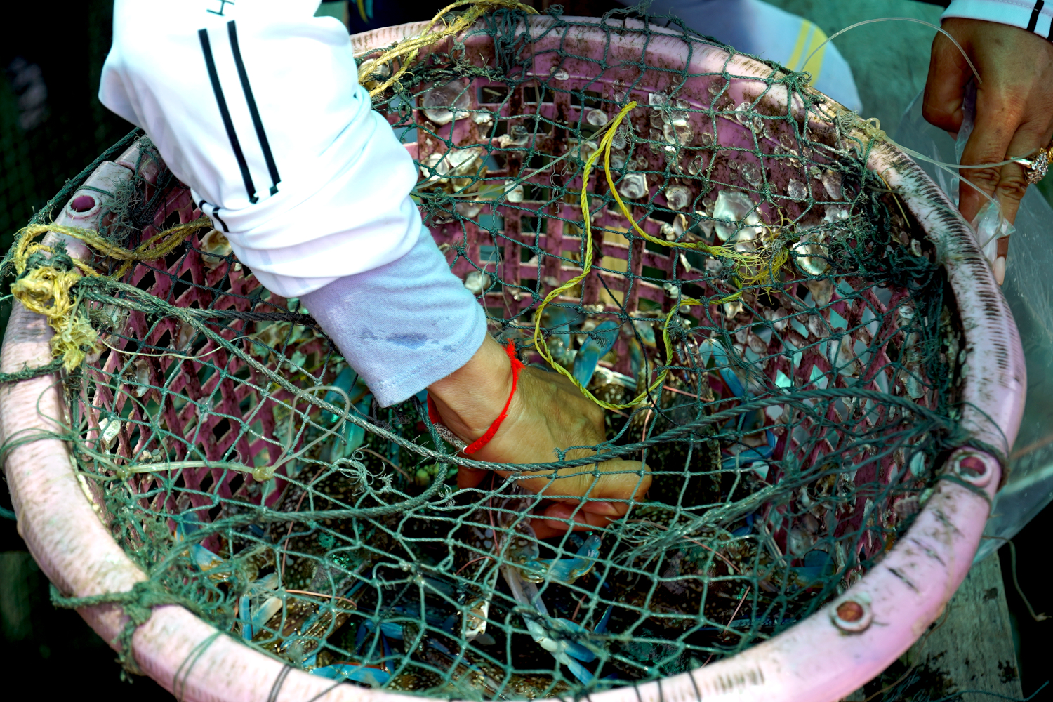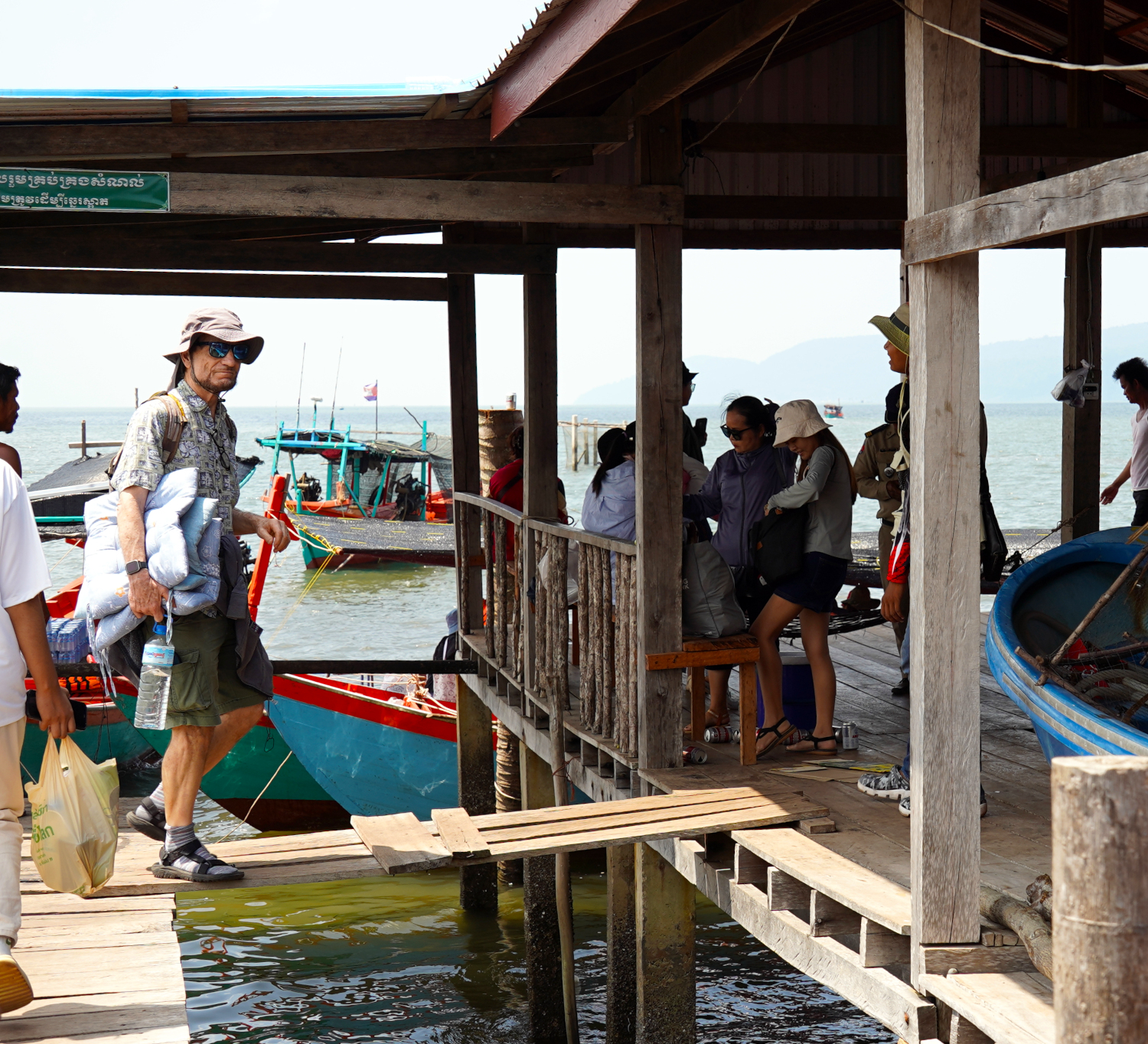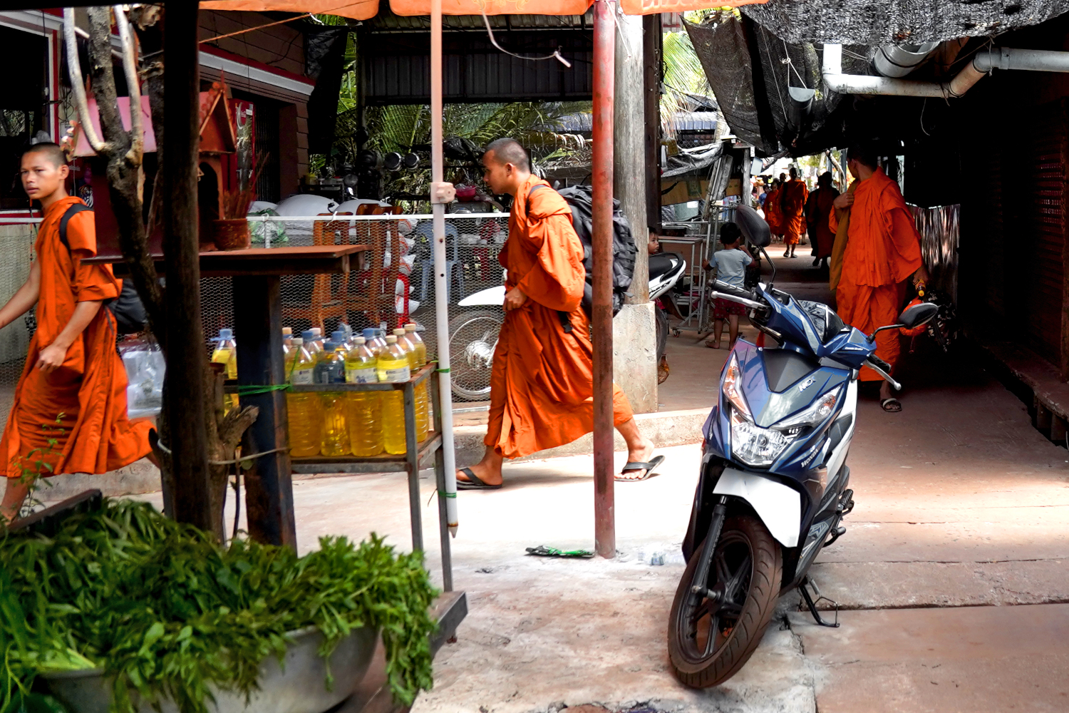 First we arrived at a shoreside town on the Gulf Of Thailand, where our boat pilot met us with a cart and hauled our gear, including a jug of drinking water, down to the dock, through narrow passageways between vendors hawking their wares in wooden stalls. We passed a group of monks in their orange robes, whom, it would turn out, we’d encounter the next day when we were snorkeling.
