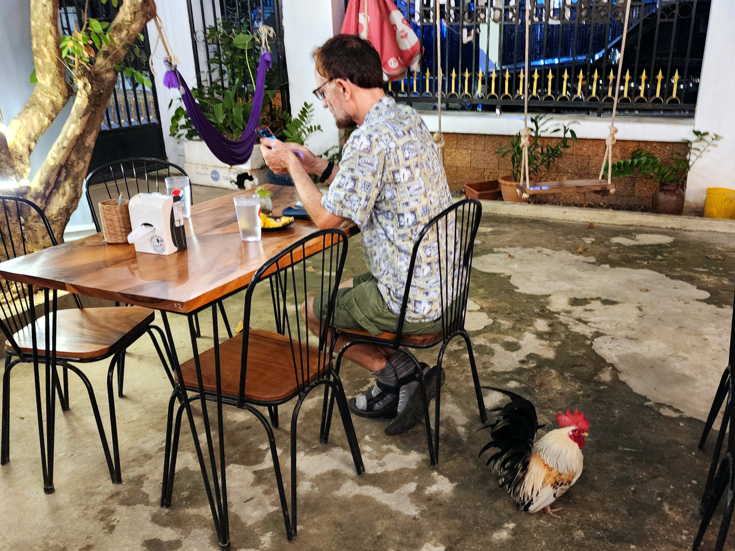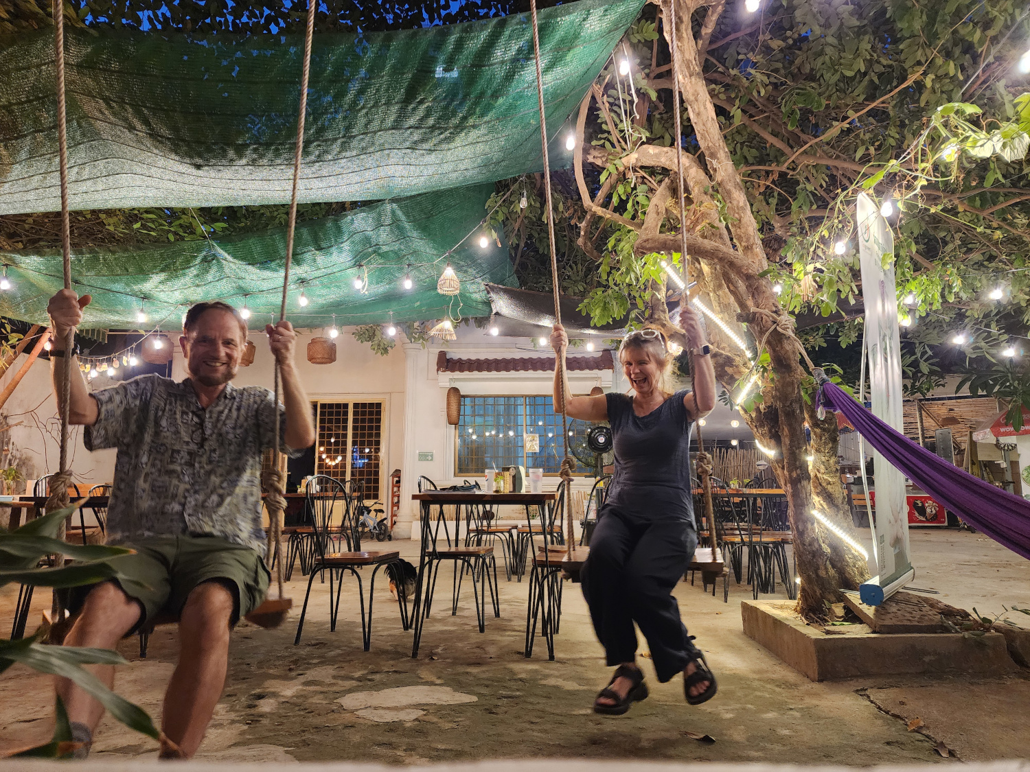 That night, we treated ourselves to dinner at a new (to us) restaurant, a cute little place with outdoor tables under big trees adorned with swings, and chickens scurrying around at our feet to wish us a happy new year.