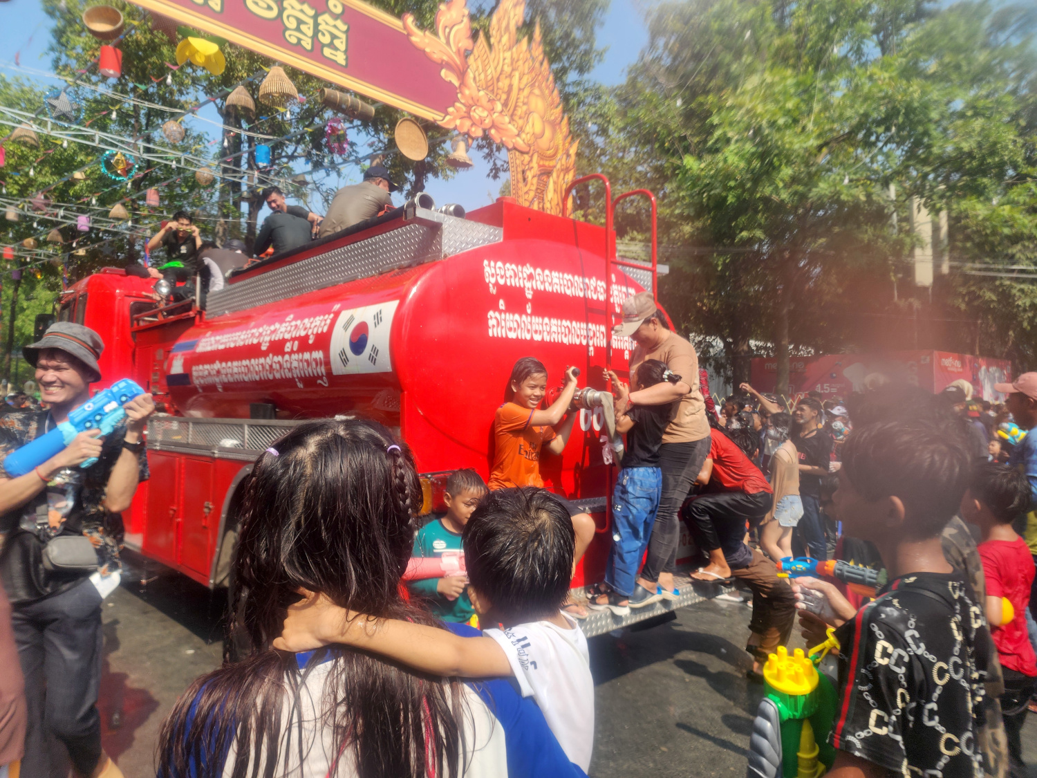 The neighborhood around Wat Phnom was packed with revelers armed with water cannons, water bowls, and water hoses to soak anyone who crossed their path. There were even fire trucks to spray people and provide refills. There were also a few people running around smearing talcum powder on people’s faces.