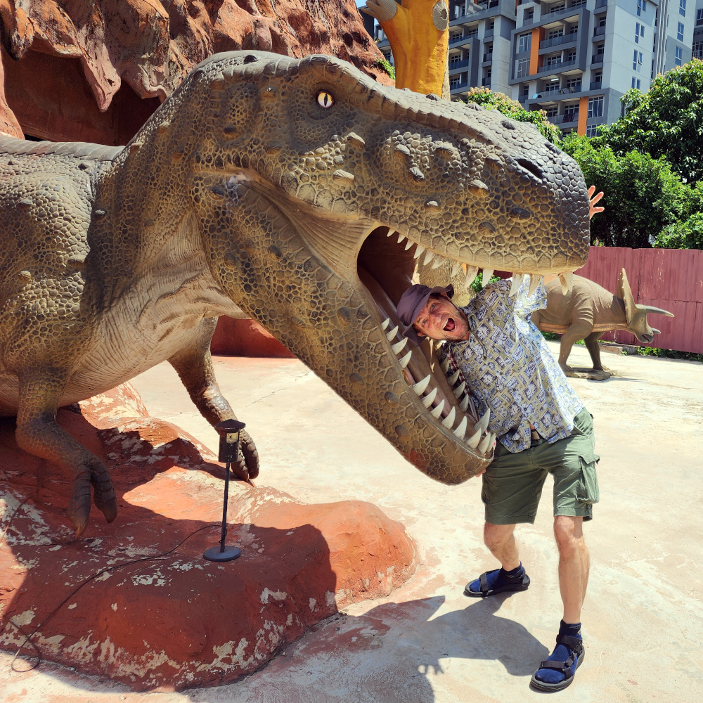 Dinosaurs Alive and the amusement park surrounding it seemed like a fun spot to bring the family. Accordingly, we were surprised to see how sparsely attended it was. Was it really such a well-kept secret? One of the people we did see, however, was Kimberly’s second grade student Thireach (tee-REE-ak) with his mom and aunt. He’s a precocious lad that she had a lot of fun teaching — and his sister, also a very bright student, was in Dennis’s sixth grade. (This would not be the last time we’d run into him unexpectedly — in fact, the next time would be in a location much more unexpected.)
