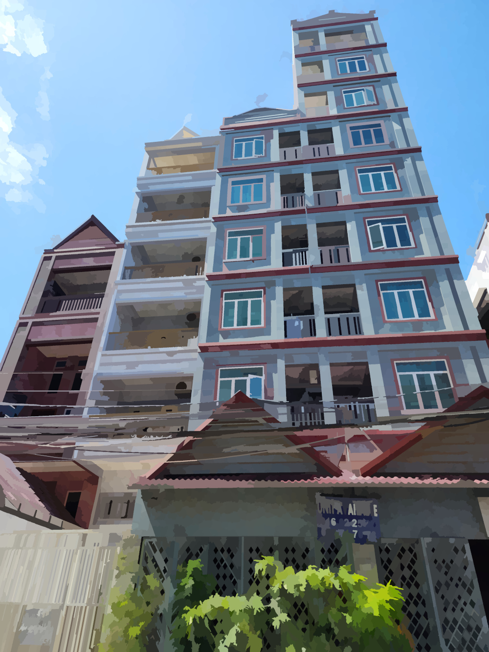 Maybe it would not be accurate to say that we had the same address, because we never really knew what our address was. Addresses don’t really seem to work very well in Cambodia, though we could give you the cross streets. Anyway, we were in the same apartment building all that time, and spent most of it in the same apartment on the third floor (which, by our standards, was actually the fourth floor). There was no fire escape, which is something that Cambodians don’t seem to think much about either. But Dennis, being ever mindful of emergency preparedness, hatched up a plan to get down to street level (or at least within 10 feet) by accessing balconies using the cords from our hammocks as well as the hammocks themselves. It’s almost a pity that we never had the need to witness this Rube Goldberg scheme in action.