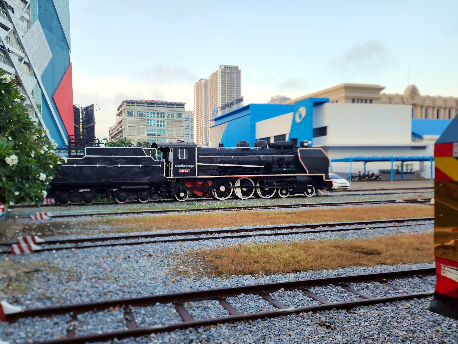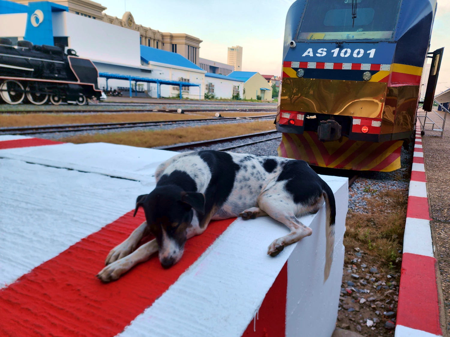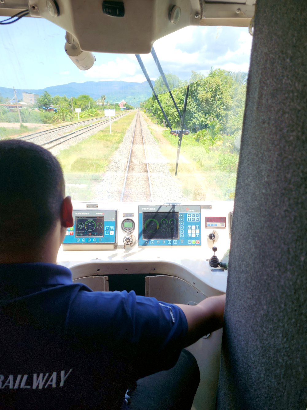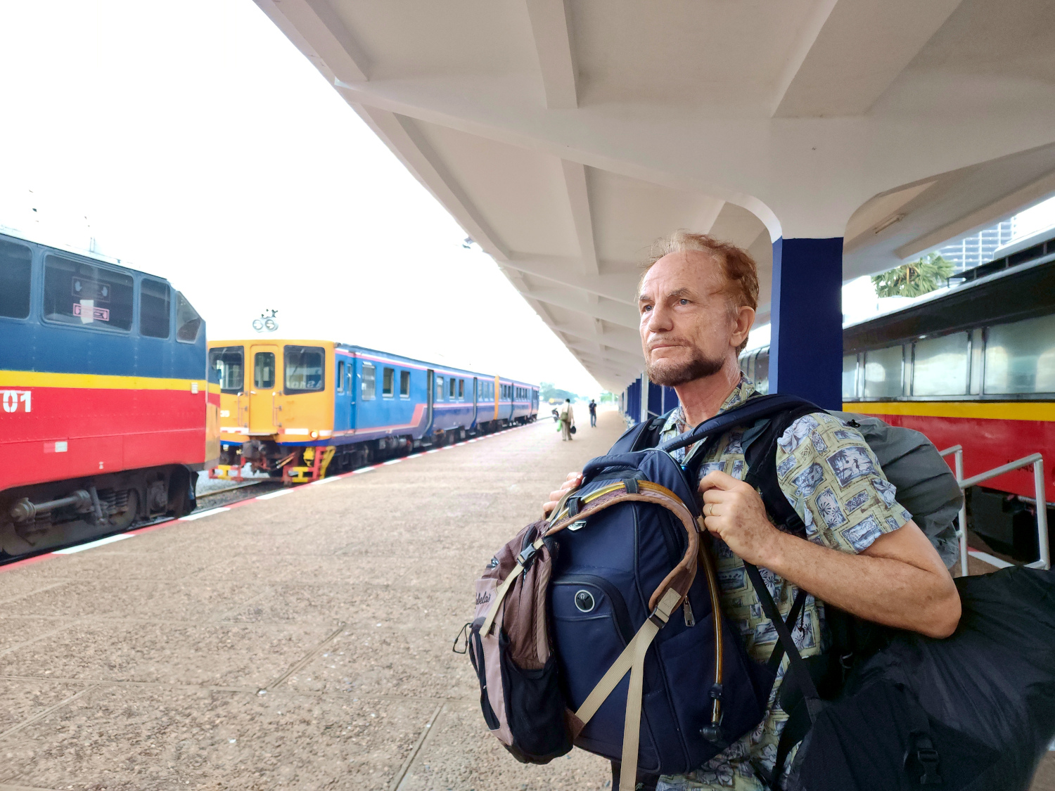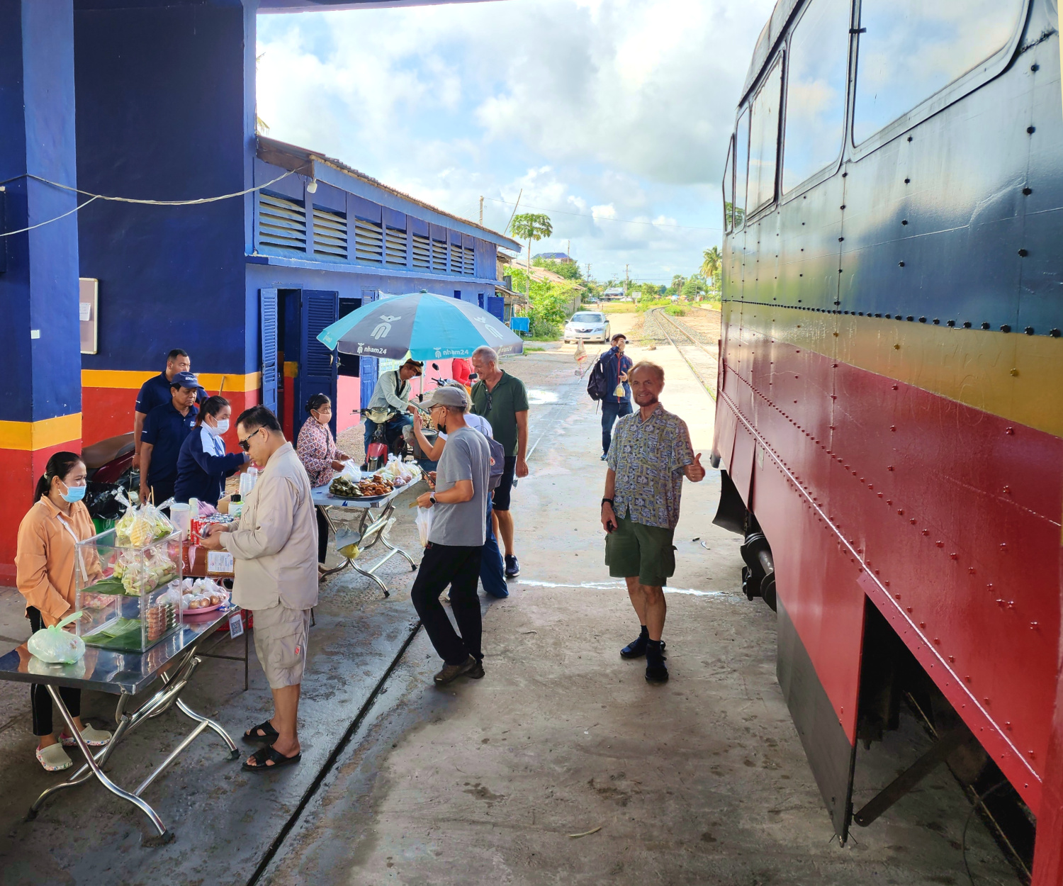 Then we drop off the keys at the hotel desk and grab a tuk-tuk to the train station, where we have a wait of an hour or so. There’s some confusion about the train we’re supposed to get on, as there are two waiting at the same platform and headed in the same direction. We think surely it must be the longer one, and at first get on it. But then we realize that no, it is in fact the other one, the one consisting of a single car, and looking more like a city trolley than a long distance train.