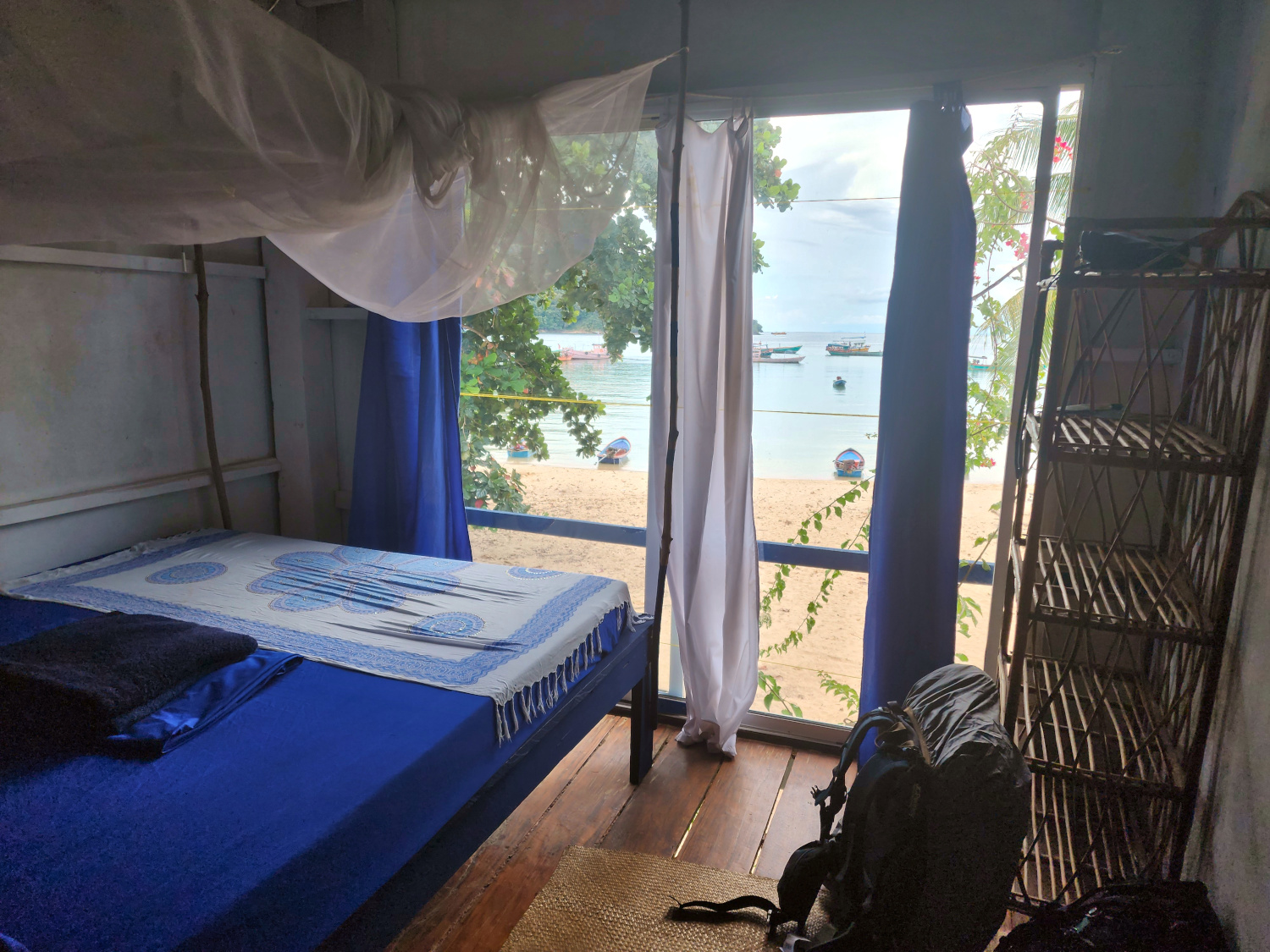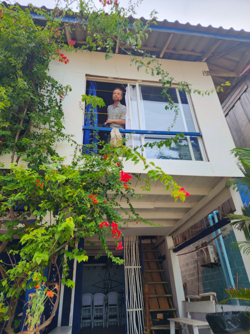 What an appropriately rustic and native place it is, looking as if it had been designed by Jimmy Buffet himself. It’s a two-story bungalow just a few yards from the beach. It’s actually a mini-hostel with three private guest rooms and a common kitchen. But since it’s off-season, we’re the only guests (and will continue to be throughout our stay). There’s also a large gathering area on the ground floor that serves as a cafe and bar when tourists are abundant. At the moment, it’s closed but we still have use of it — and the entrance is the entire front wall, which accordions up to create an open-front living room with a four-star view.