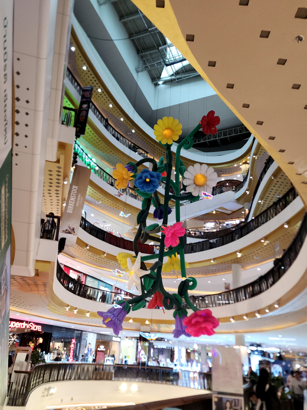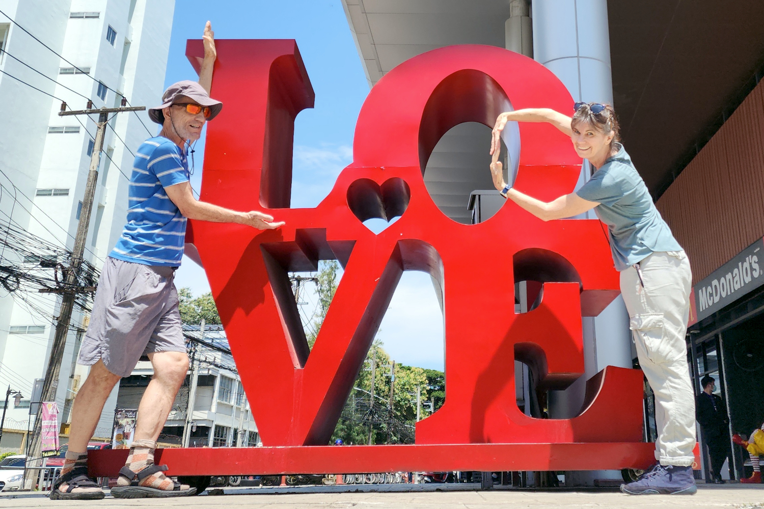 On our excursions, we come upon a large metal sign that says “Love”, somewhat similar to one we found in Bentonville, Arkansas a few years earlier. So naturally we have to pose for a photo with it. We make our way to the mall, in quest of shoes and a power adaptor. At the entrance to the mall, uniformed guards greet us with a salute, which they also provide when we exit. It’s a touch that seems quite appropriate for Thailand, a country that seems to operate with military precision and orderliness; we’ve also noticed that it seems th neational anthem is played every morning in (at least some) public spaces.