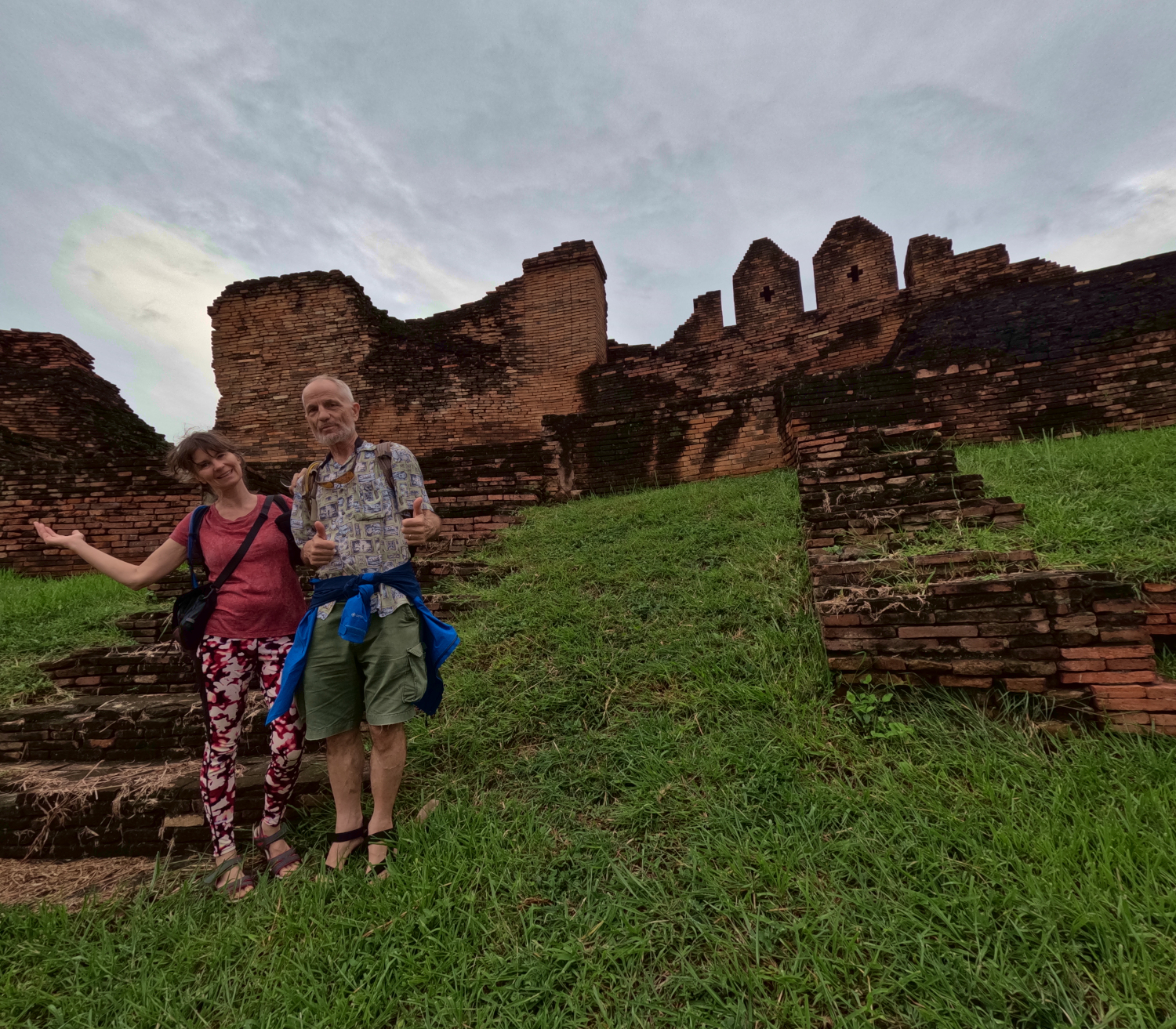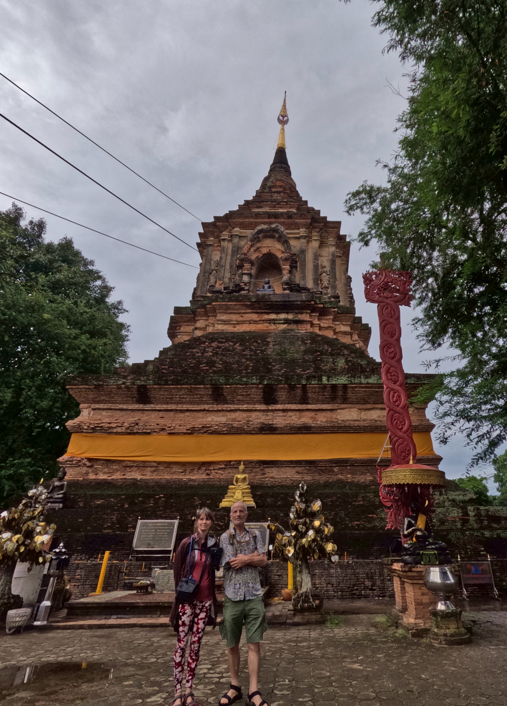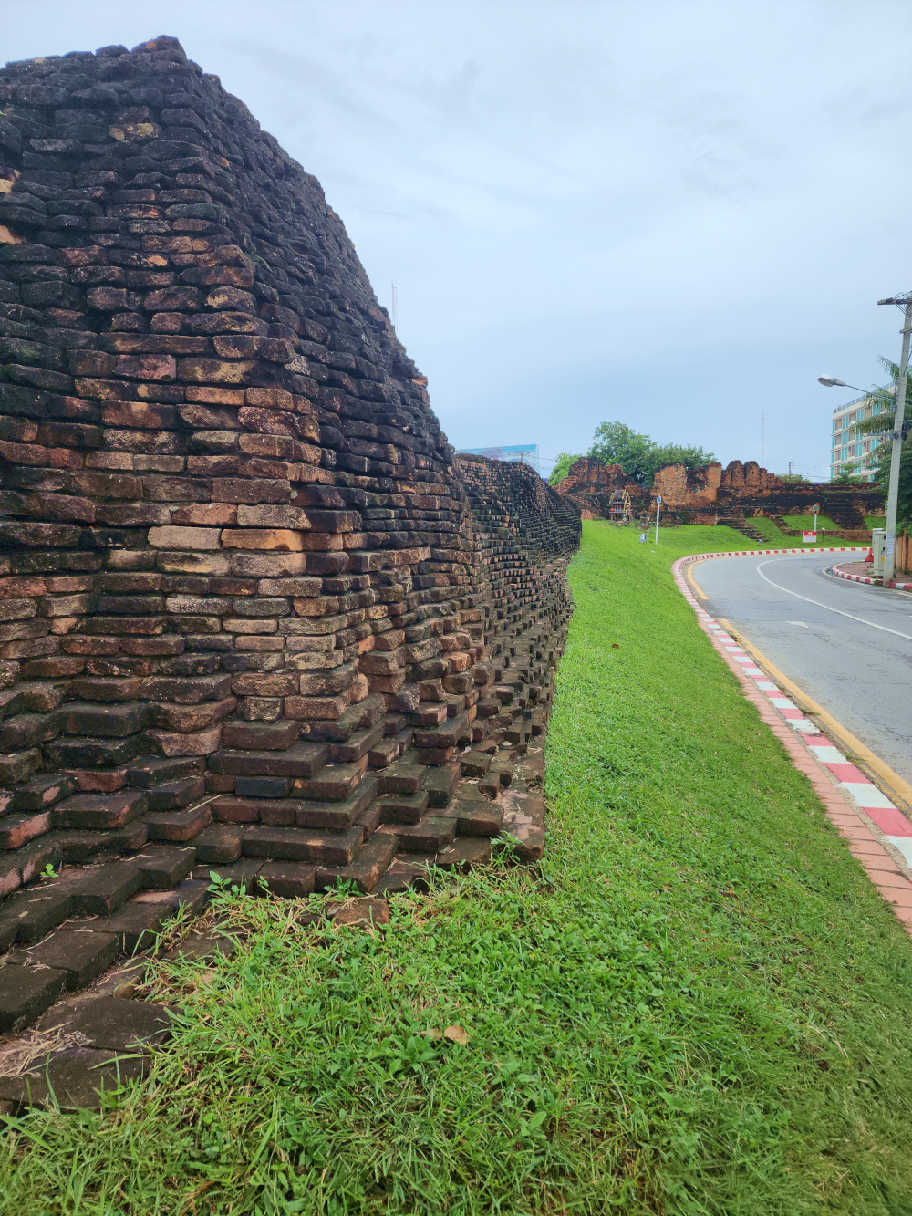 Old Town features an ancient wall, crumbled but still standing, surrounded by a moat; and it’s really in its own way as cool as all the wats. But we check out the wats too, as many as we can. So many that it’s hard to keep track of them all. One of them (Wat Lok Moli) has old, faded bricks that look more intriguing to us than those which are restored and refurbished, perhaps to the extent of replicating and replacing original features.