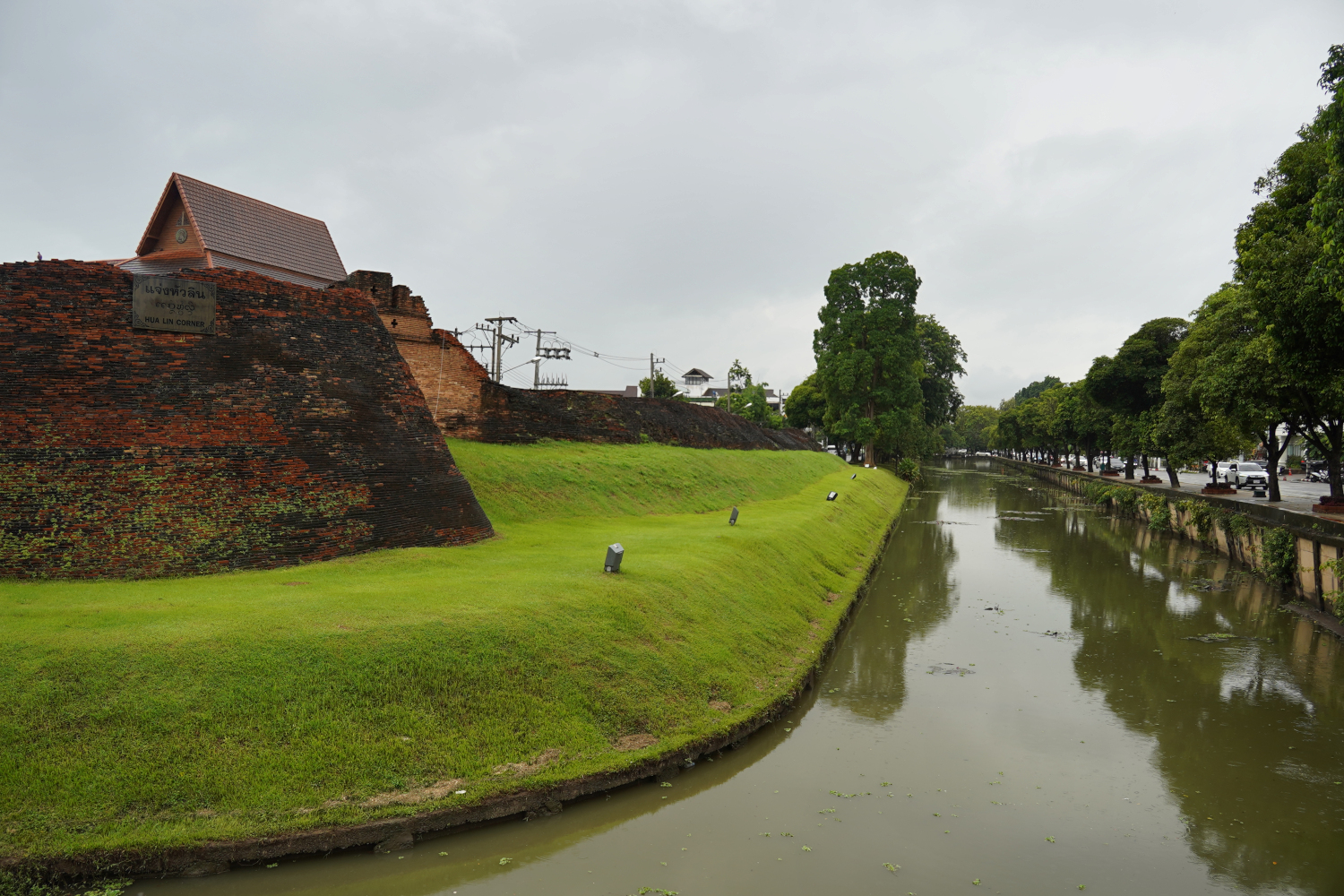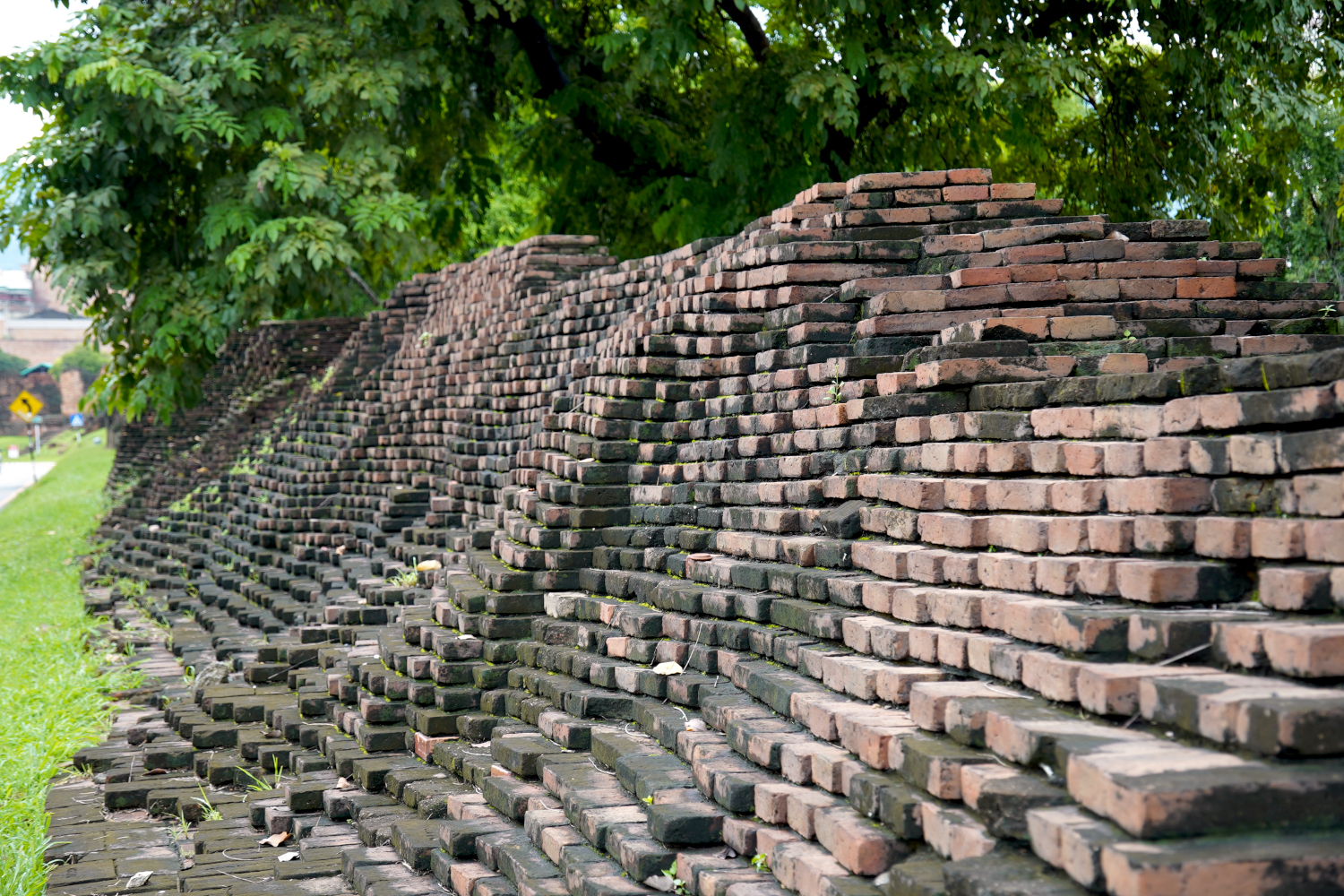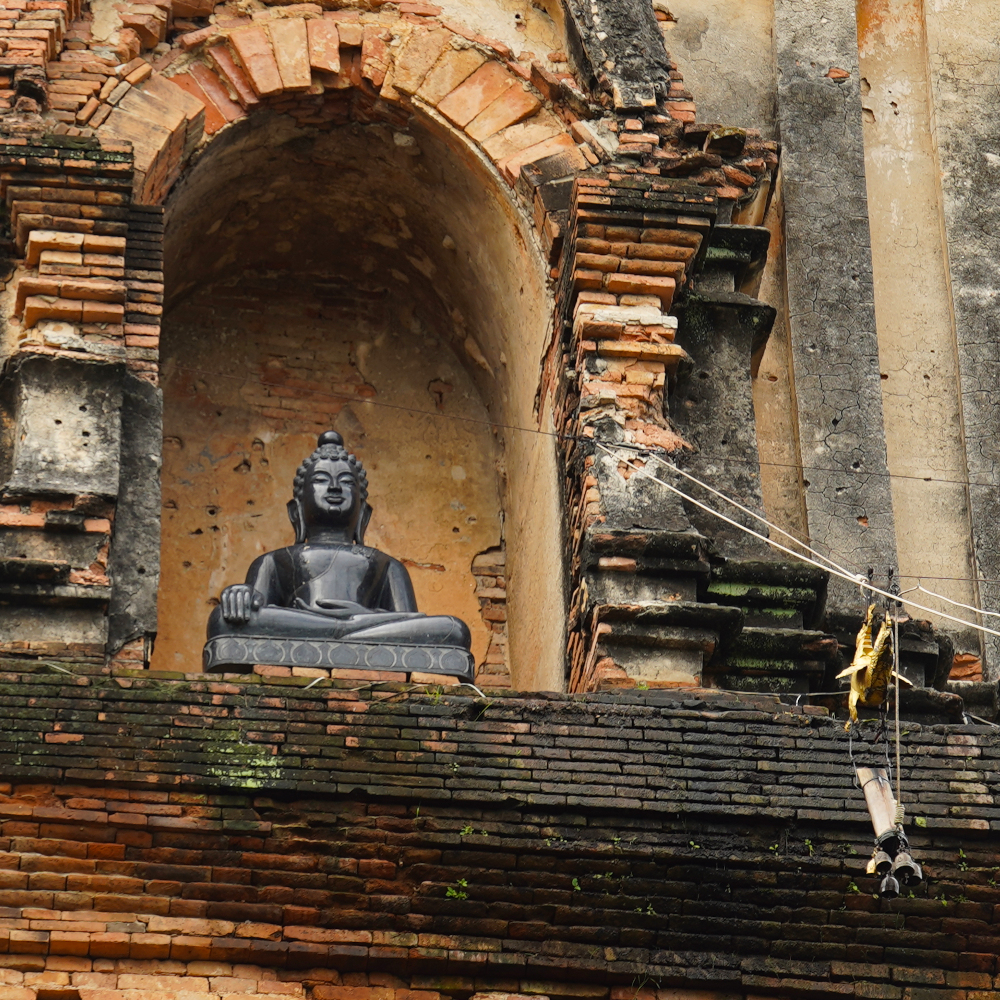 Old Town features an ancient wall, crumbled but still standing, surrounded by a moat; and it’s really in its own way as cool as all the wats. But we check out the wats too, as many as we can. So many that it’s hard to keep track of them all. One of them (Wat Lok Moli) has old, faded bricks that look more intriguing to us than those which are restored and refurbished, perhaps to the extent of replicating and replacing original features.