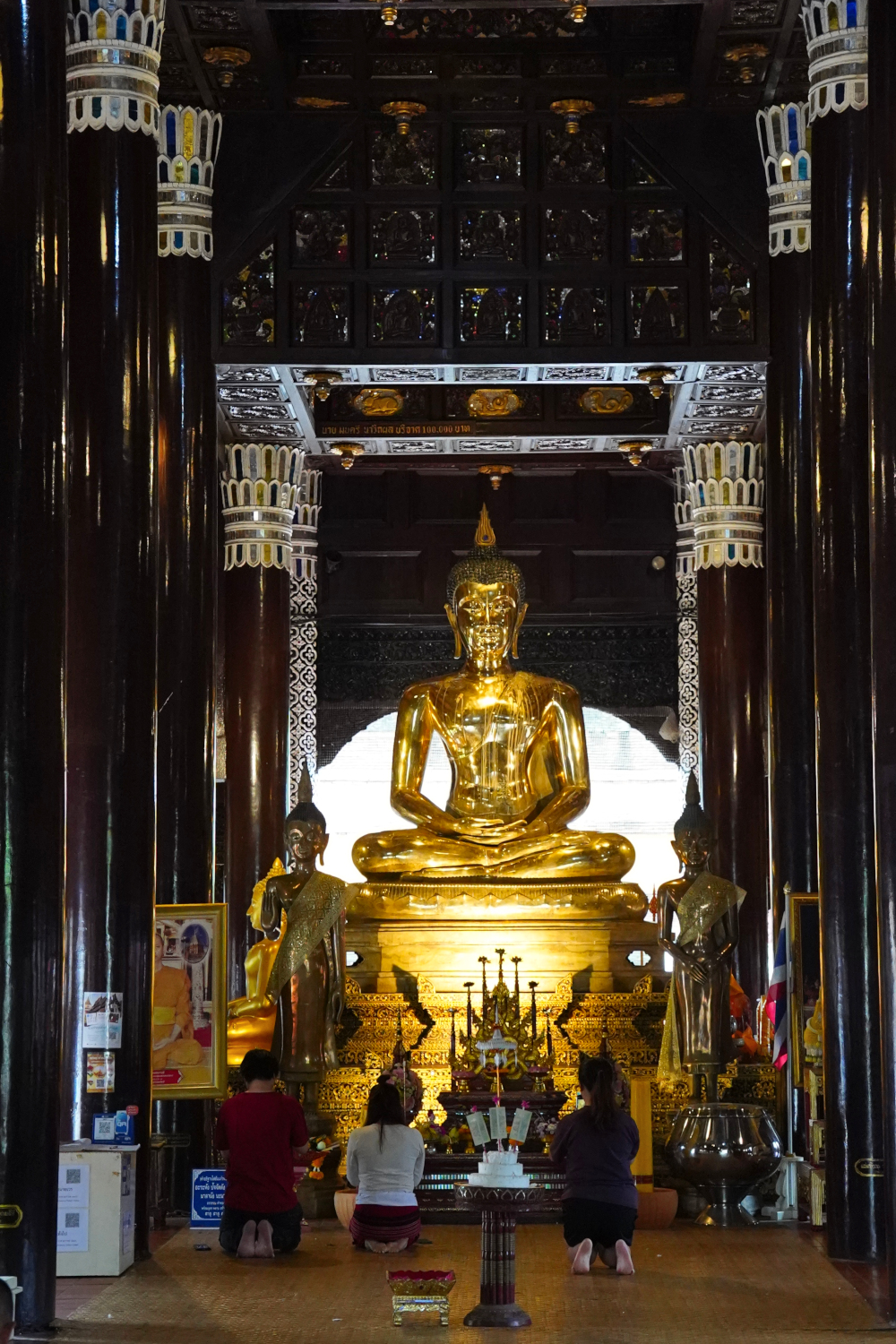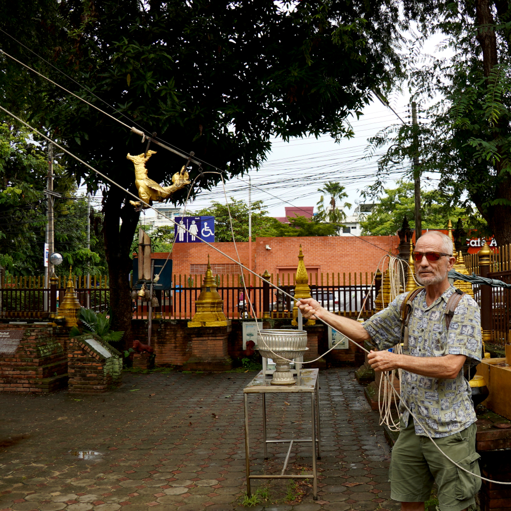 In front of this wat is a station with a bucket attached to a rope and pulley. Visitors can fill the bucket with water and pulley it up to the Buddha sitting atop the portico. This tradition of offering a drink to Buddha is a ritual of purification, generosity, devotion and so on. Water represents clarity, impermanence and serenity; and offering it to the Buddha is a symbolic gesture of letting go of earthly attachments. Of course, we don’t have a Buddhist bone in our bodies (though we have a lot of respect for Buddhism’s core principles); but we can’t resist partaking anyway.