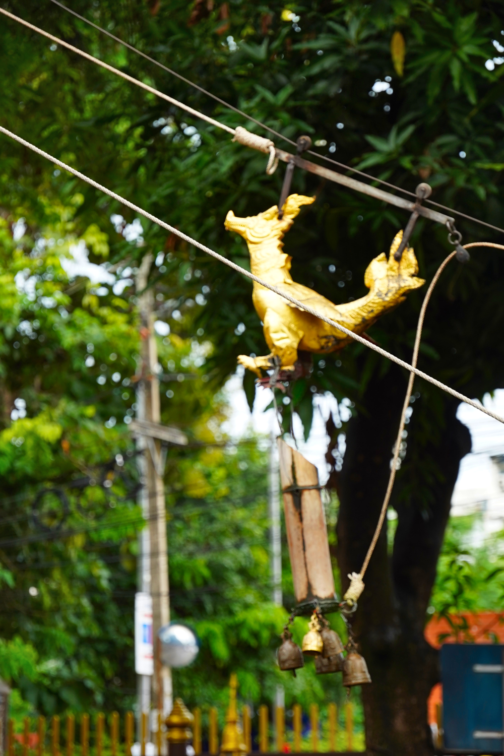 On the same day, we visit Wat Phra Sing, with its distinctive round golden chedi and other golden structures. They’re not really gold, of course,; they’re just covered with brassy paint. But they look practically new, in contrast to the aged look of the smaller temple we’ve just visited. It appears that the public prefers the shiny and bold to the modest and weathered, because there is quite a crowd at Wat Phra Sing. And the stray dogs know where the people are (and therefore where the best chance of snagging a handout is), so they meander among the structures too. And when a monk rings a big bell at the appointed hour, they howl their approval and/ or disapproval.