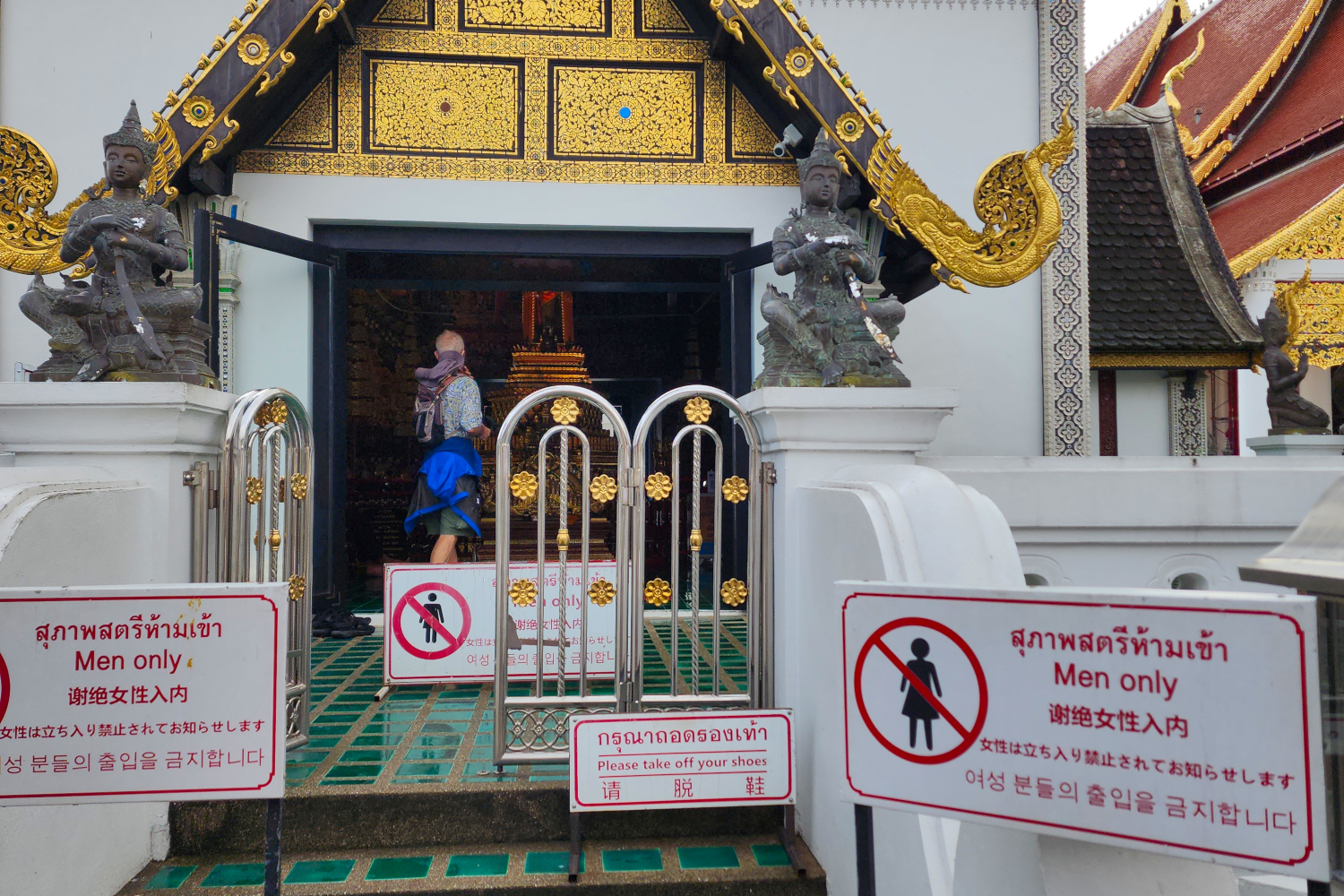 There are several different buildings in this complex, and one of them is a little sanctuary which, like most of the other buildings, has a sign out front telling visitors to remove their shoes before entering. But in this case, the signs also say that this rule applies only to men. Because only men are allowed to enter at all. Chiang Mai is a pretty modern city, but some ancient traditions are alive and well. Well, not to worry: the one of us who entered can assure the other one that she didn’t miss much.