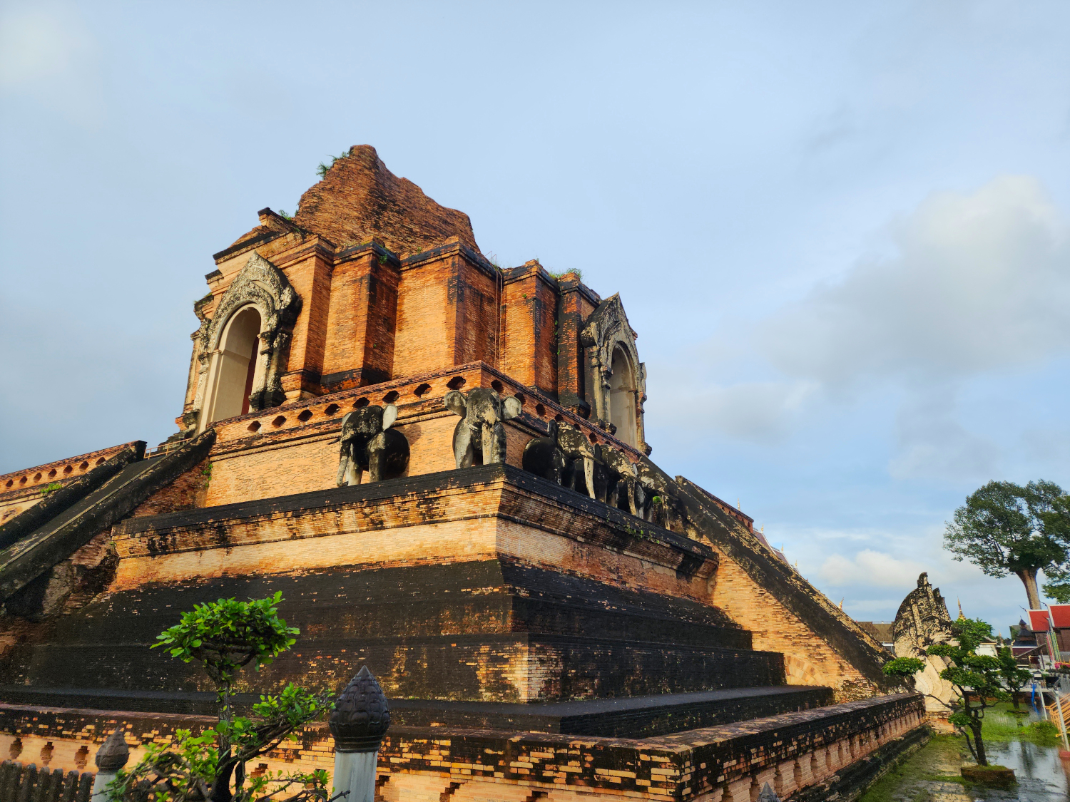 The piece de resistance of our whirlwind wat tour is Wat Chedi Luang , which is visible for some distance with towering, ruined stupa. This one of only only two wats we visit that charges an admission fee, the staggering sum of 50 baht (about $1.50). Because of its crumbling appearance, it gives the impression of being the oldest wat in town. But it isn’t. (See below.) One of its most arresting features is the array of life-size stone elephants circling the building on the second story terrace, as if trying to hold up the wall — or crash down the floor. Well, actually, they used to circle the building once upon a time, but quite a few are missing now. Just enough of the original herd remain to give you some inkling of what the effect was like in the temple’s heyday.