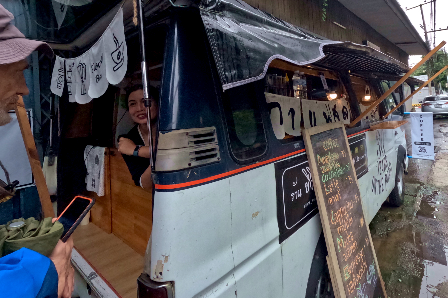 At one point after exiting a wat, we notice that across the street is a food vendor operating out of the side of a specially fitted vintage camper van. On the side of it are the words “30+ Years on the Road”. Naturally we have to go over and talk to the proprietors, because that slogan perfectly describes us. We spent 30 years touring the U.S. with our theatrical company, and now we are extending the tour indefinitely — and extending the roads to encompass the globe.