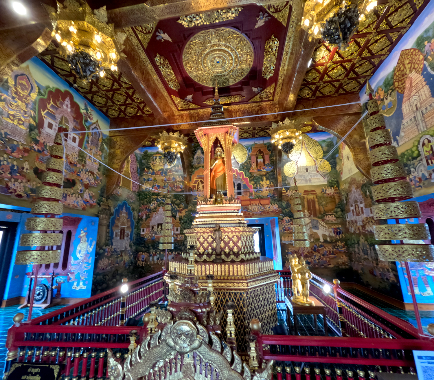 Next we return to Wat Phra Sing, which we visited the day before — but this time, as we hoped. it was much less crowded. This popular wat is noted for its shiny gold-painted chedi and other structures that appear to be made of solid gold or brass (but when you get up close you can see that the exterior is a kind of sheet metal, interconnected rather seamlessly).