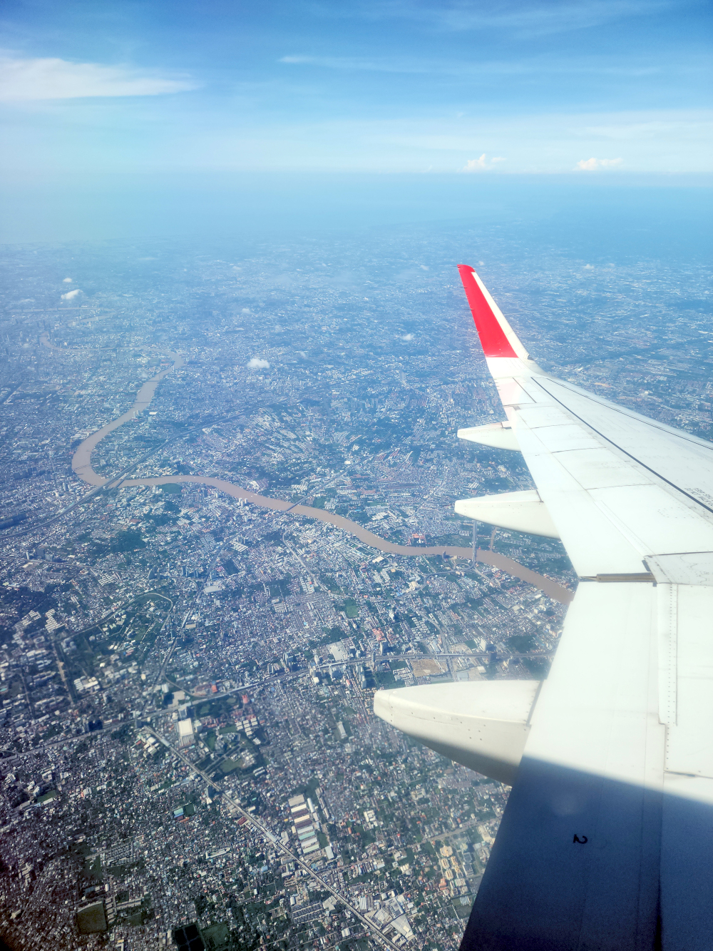 Next morning, we’re off at 5:30 to the colorful Bangkok airport. After the security folks have pawed through our bags, we later discover that Dennis is missing a tube of toothpaste and his universal AC power adaptor. The latter can be hard to come by, and it’s a bit of a hassle when we both have to share one.