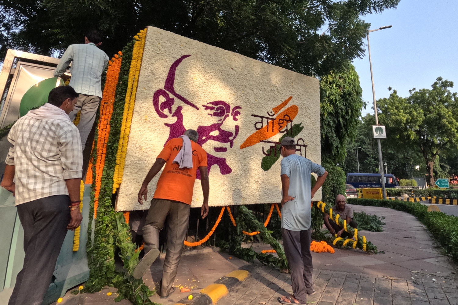 Passing by a park, we see some men arranging flowers into a portrait of Gandhi — the next day is his birthday, a holiday. Several different times, we are hustled by guys on the street who appear to be friendly and helpful; but they’re actually tour guides or taxi operators. One of them speaks several languages, including Japanese.