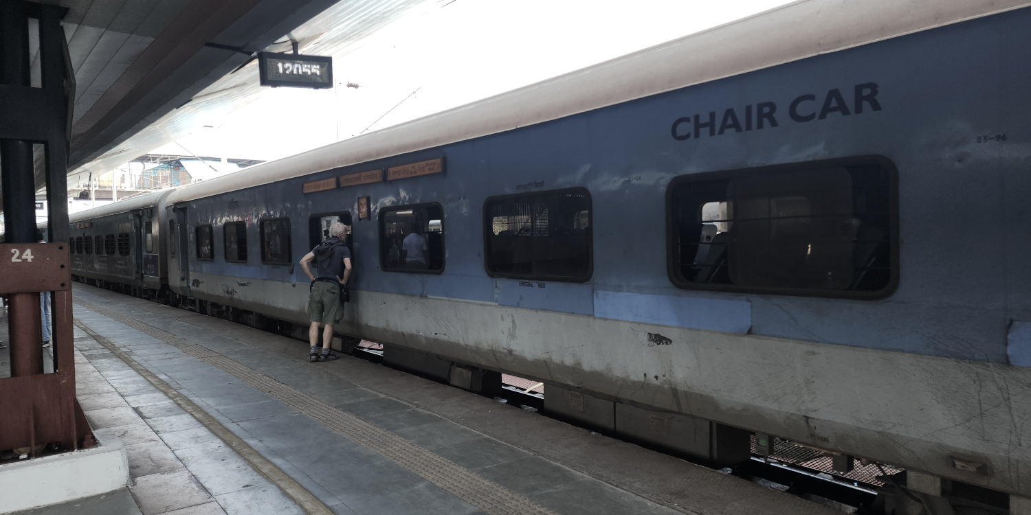 We still arrive at the station in plenty of time; in fact, it’s about three hours until our train is due. So we try to stake out a place to sit, which is a bit problematic. The few benches are mostly taken up, and as usual in India, people are sitting or sleeping all over the floor. There’s supposed to be a lounge with air conditioning, but we can’t locate it; apparently it’s upstairs, in a section now blocked off. But we do find an empty bench to wait on.