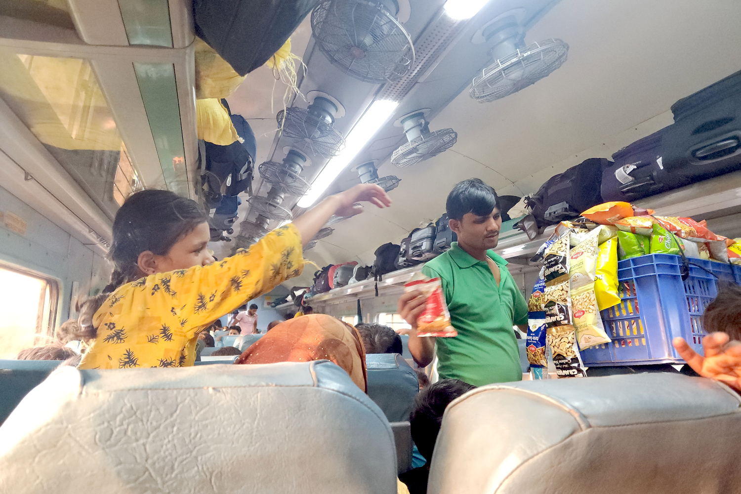Our seats are comfortable enough, one of us on the aisle and one in the middle; and the passenger at the window, a woman headed home to Haridwar (the train’s destination) is quite pleasant. The seats in front of us, designed to accommodate three humans, are taken up by a family of six, with kids stacked on top of kids, and a couple of them even sprawled on the fold-down trays attached to the seats in front of them. As usual on Indian trains, we are booked to capacity. And before the trip is over, the toilets become quite disgusting.