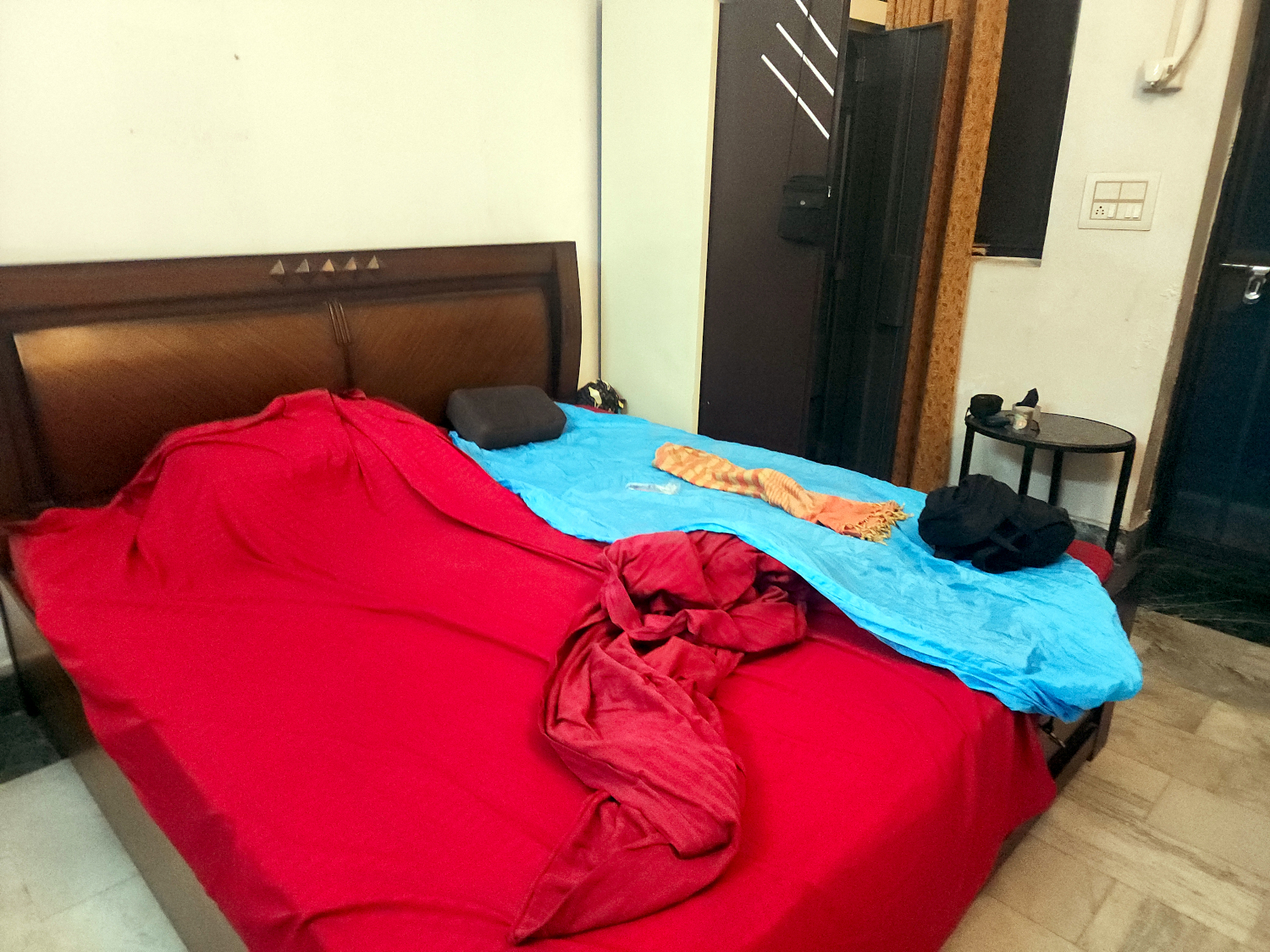 For some reason not yet clear to us, it appears we are expected to occupy the smaller of the two bedrooms. But left to our own devices, we decide that the larger one is much better suited to us. It has a wardrobe, a dresser, an air conditioner, and a ceiling fan that isn’t nearly as noisy as the one in the smaller room. (It also has a TV, which might be a selling point for many people, but is of zero interest to us.) Aside from the red bed sheets, everything is rather satisfactory.