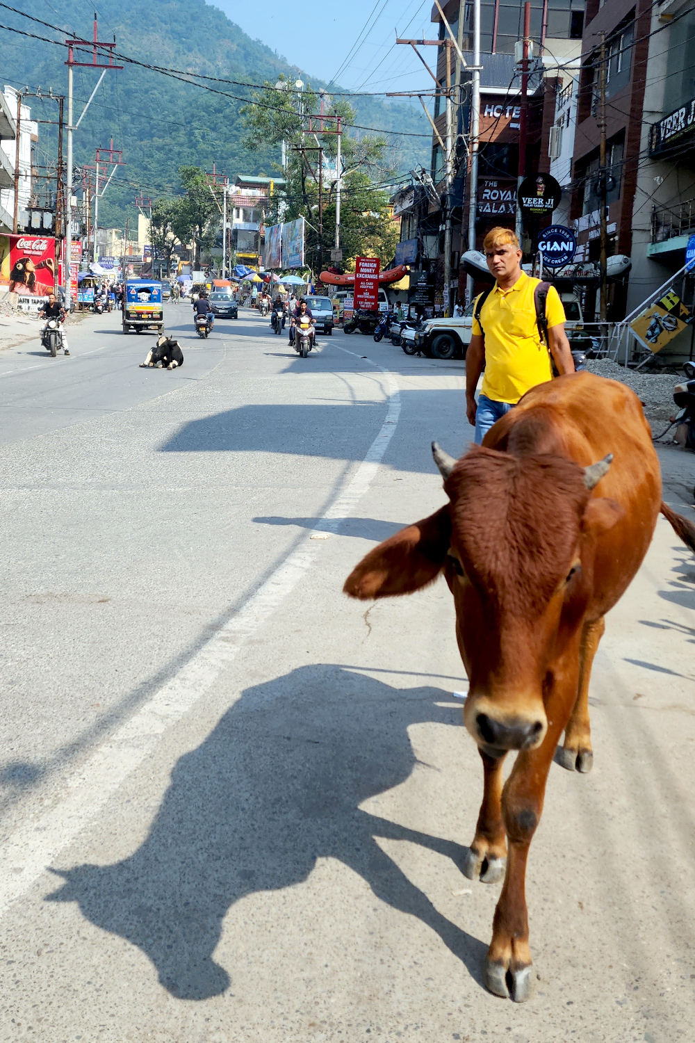 We get a sense of he mounting anticipation when we spend a Saturday trekking into the nearby city of Rishikesh, where Kimberly soon will be undergoing her training as a yoga instructor. On this, our second trip to Rishikesh, we actually go into the “hip” part of town, (Topovan) which requires taking a separate tuk-tuk; the tuk-tuks that shuttle between cities (such as the one we took to get here) are not allowed to enter the touristy area where we want to go — there’s even a checkpoint where guards ensure that only tuk-tuks licensed for that route make it through to the promised land.
