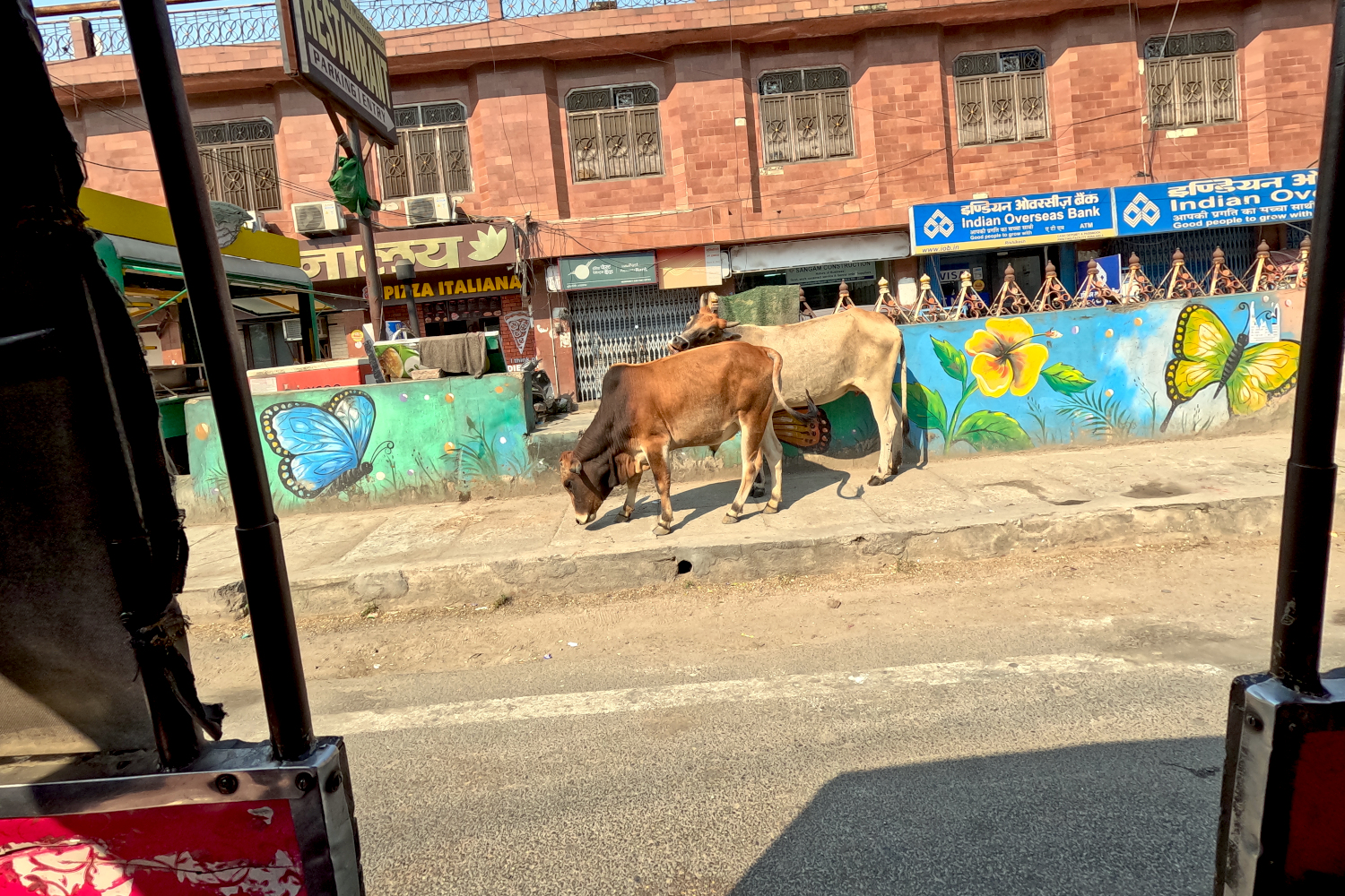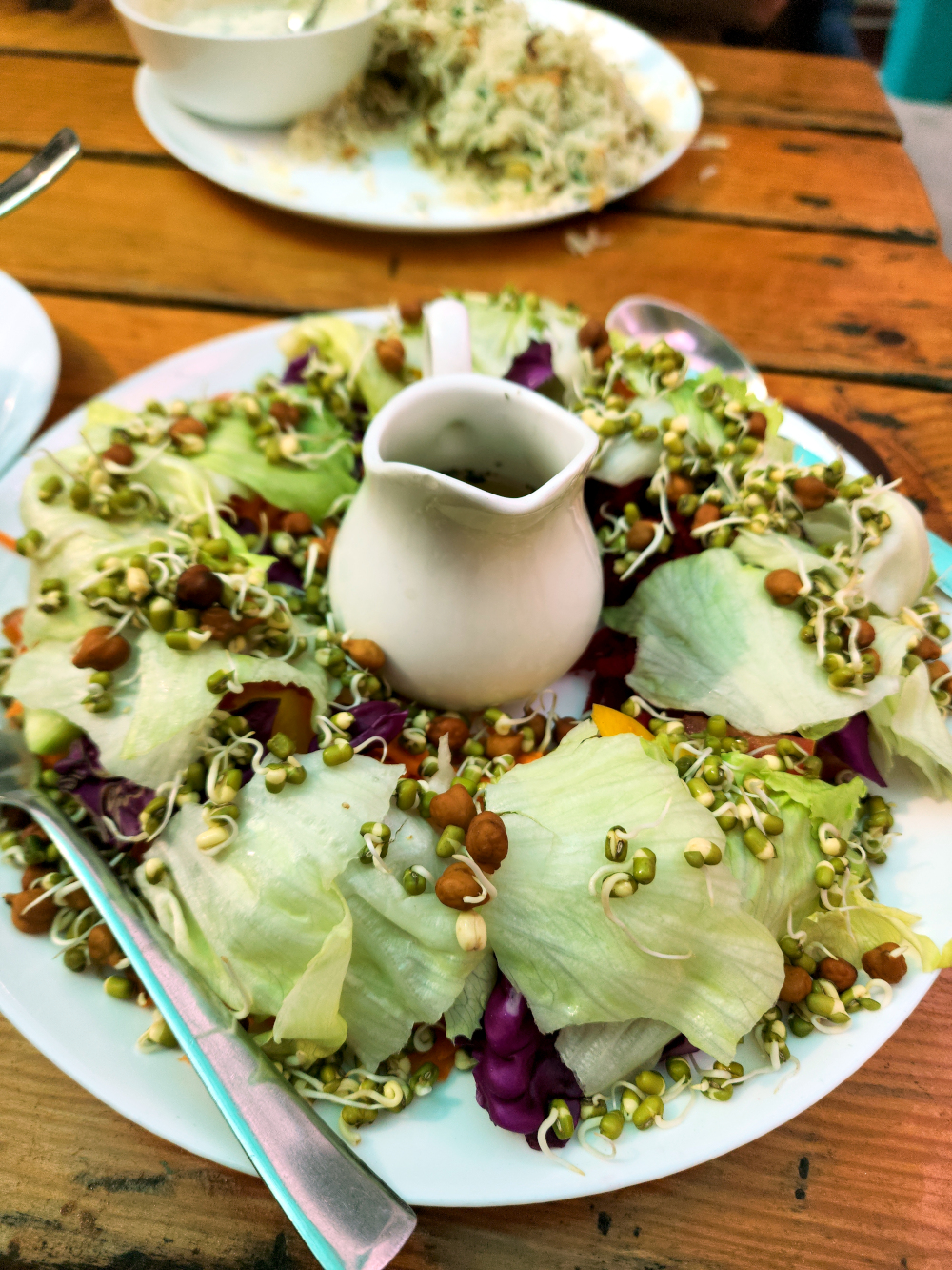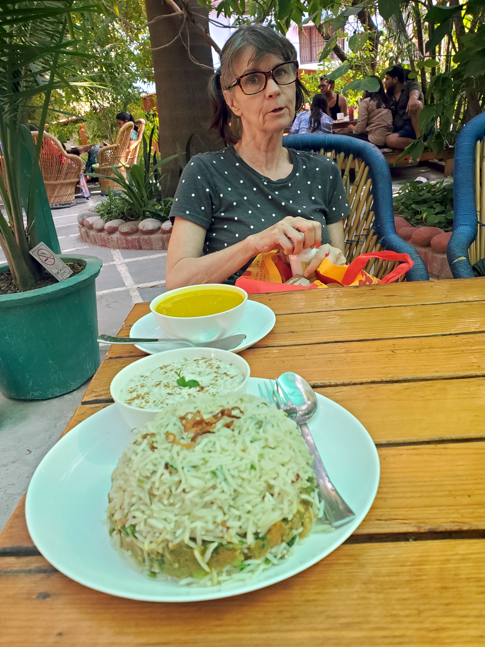 While we’re in the neighborhood, we scout out the location of the yoga school where Kimberly will be studying. It’s an interesting street, and among other things features a charming little outdoor (shaded) tea shop/ cafe/ restaurant where we have lunch. The cuisine is vegetarian, like everything else in town, and has some excellent food with large portions. It also, we learn, has a free restroom, which we can access any time we’re in the neighborhood, and that’s always a good thing to know about.