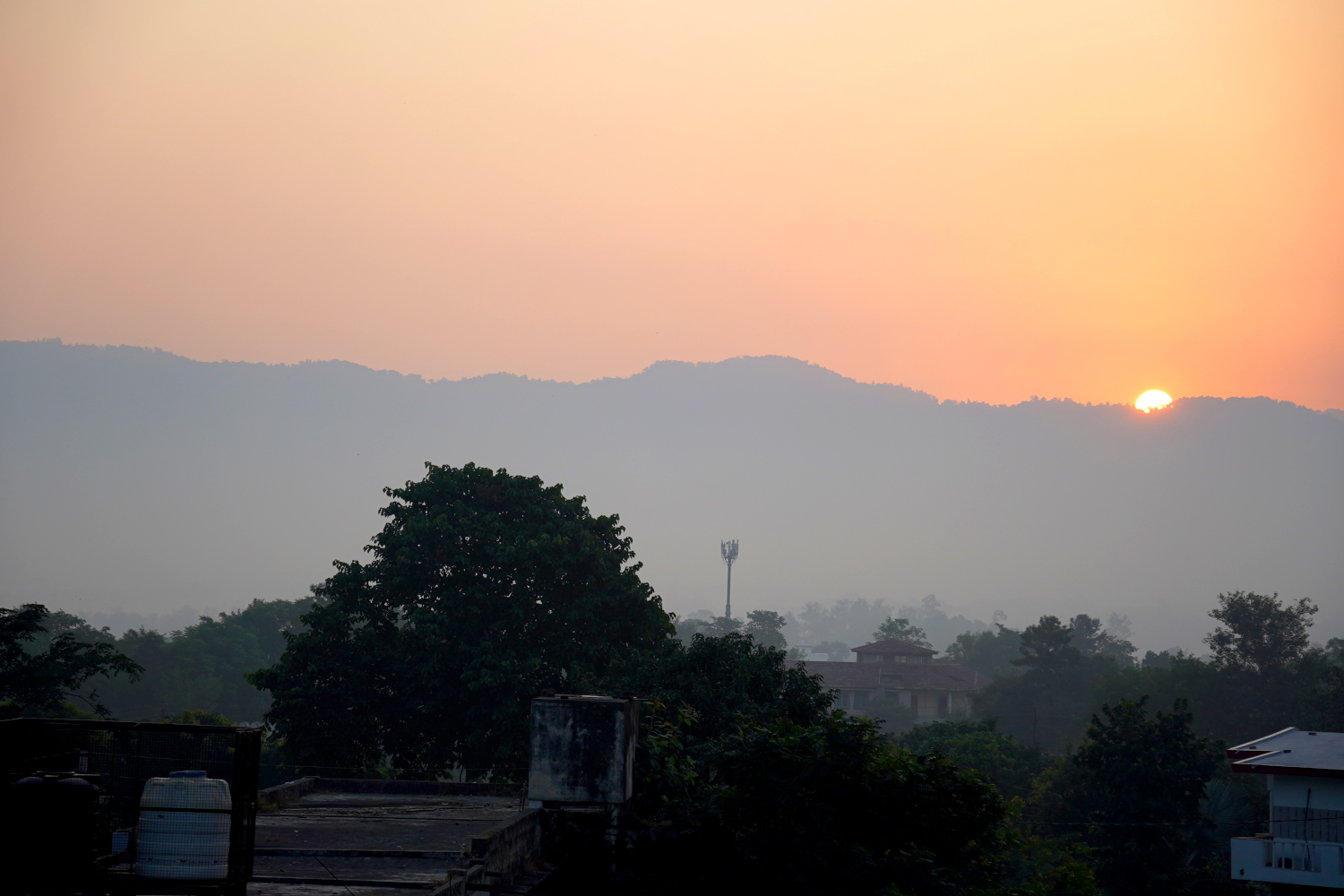 PICTURED: sunrise view from our balcony, return of our morning feathered visitor and a cow traffic jam on the road between us and school.