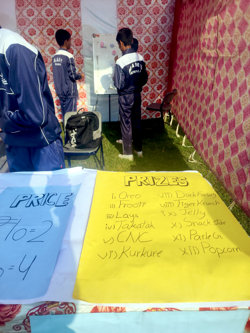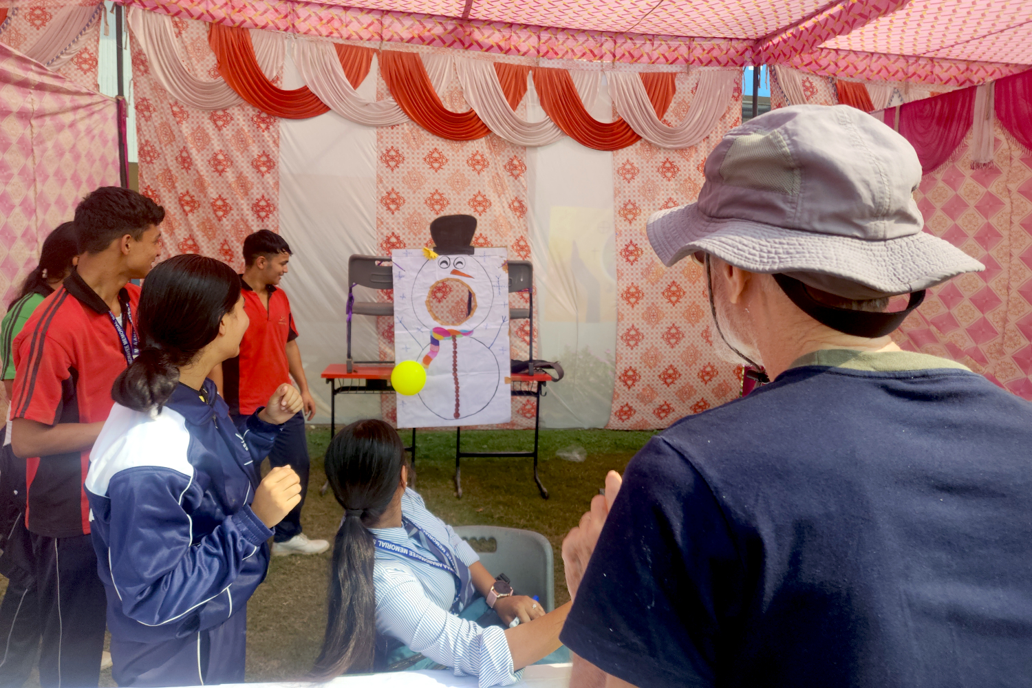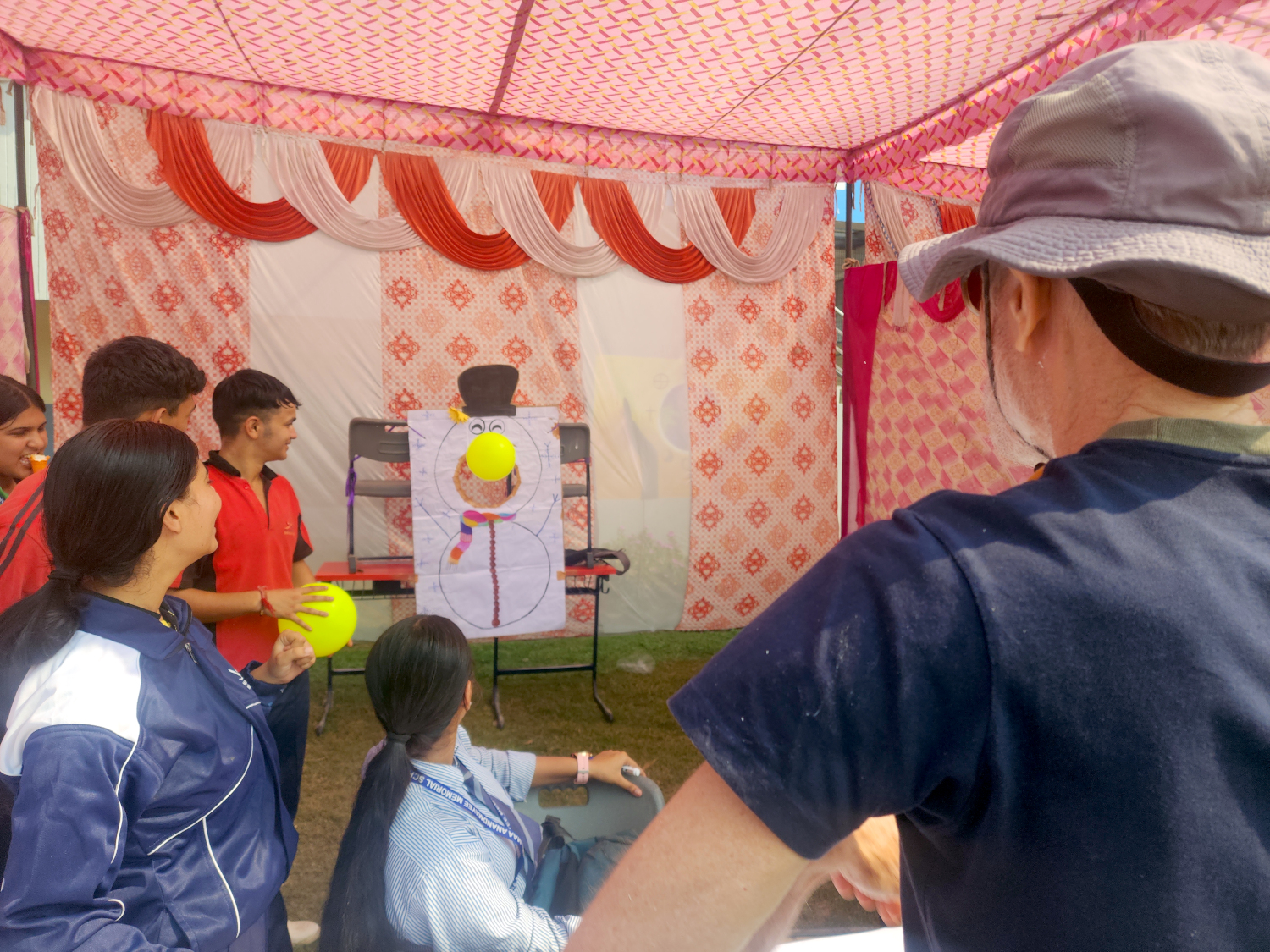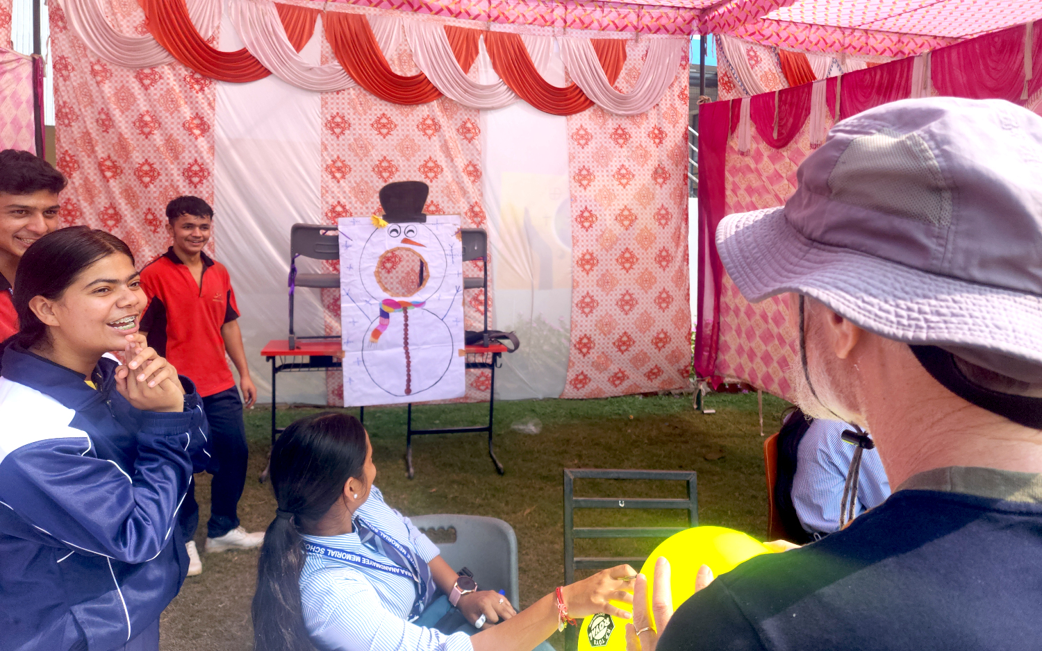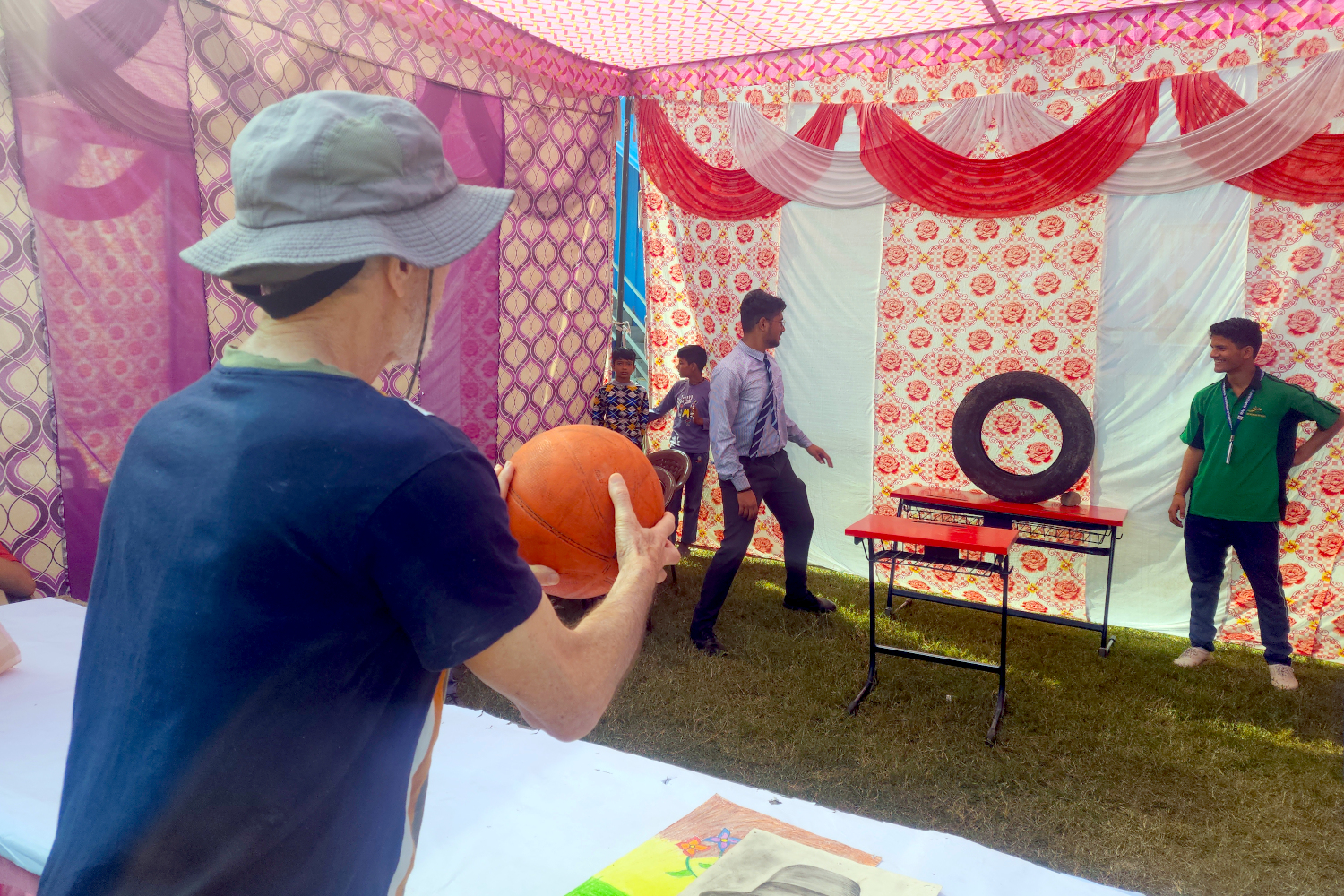 Some of the older students are operating carnival type booths with games of skill(?) including shooting a basketball through a tire. These are students whom Dennis teaches, so of course they egg him on to participate. Which he does, with a couple of the games, hamming it up, much to the students’ delight, with an overly elaborate preparation before taking a shot. And he comes very very close to scoring. Really.